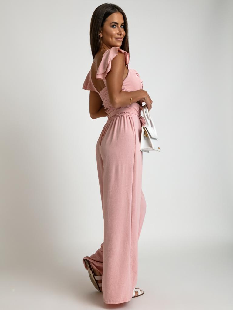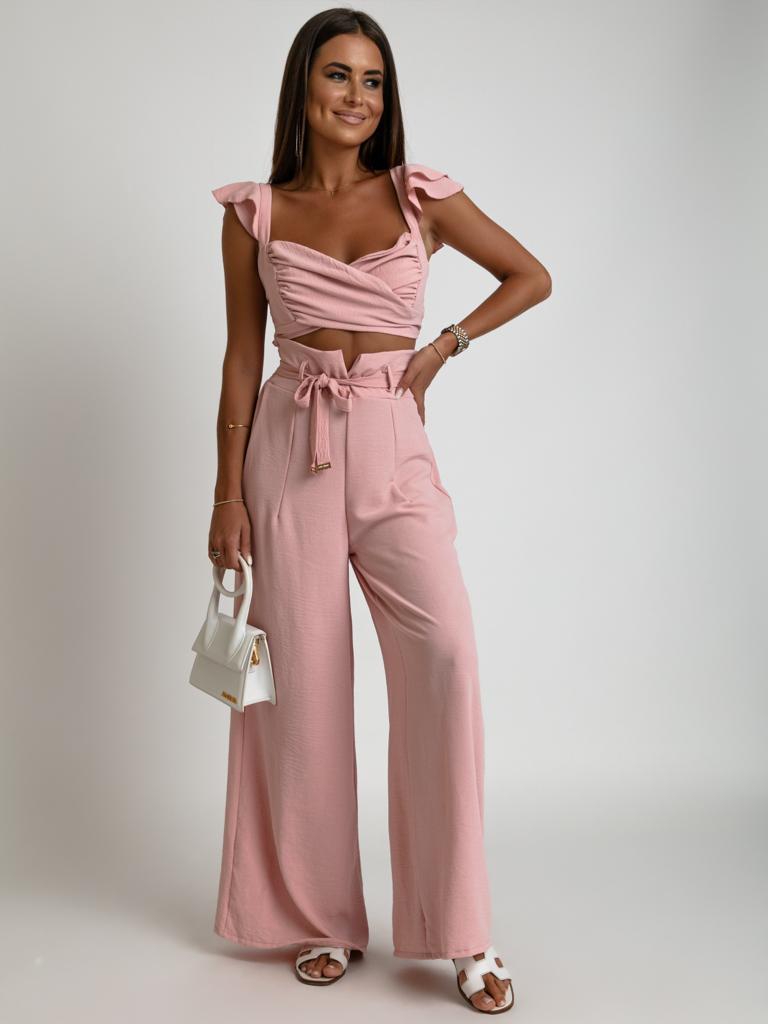 Elegancki komplet spodnie wyoski stan oraz top z falbanką pudrowy róż