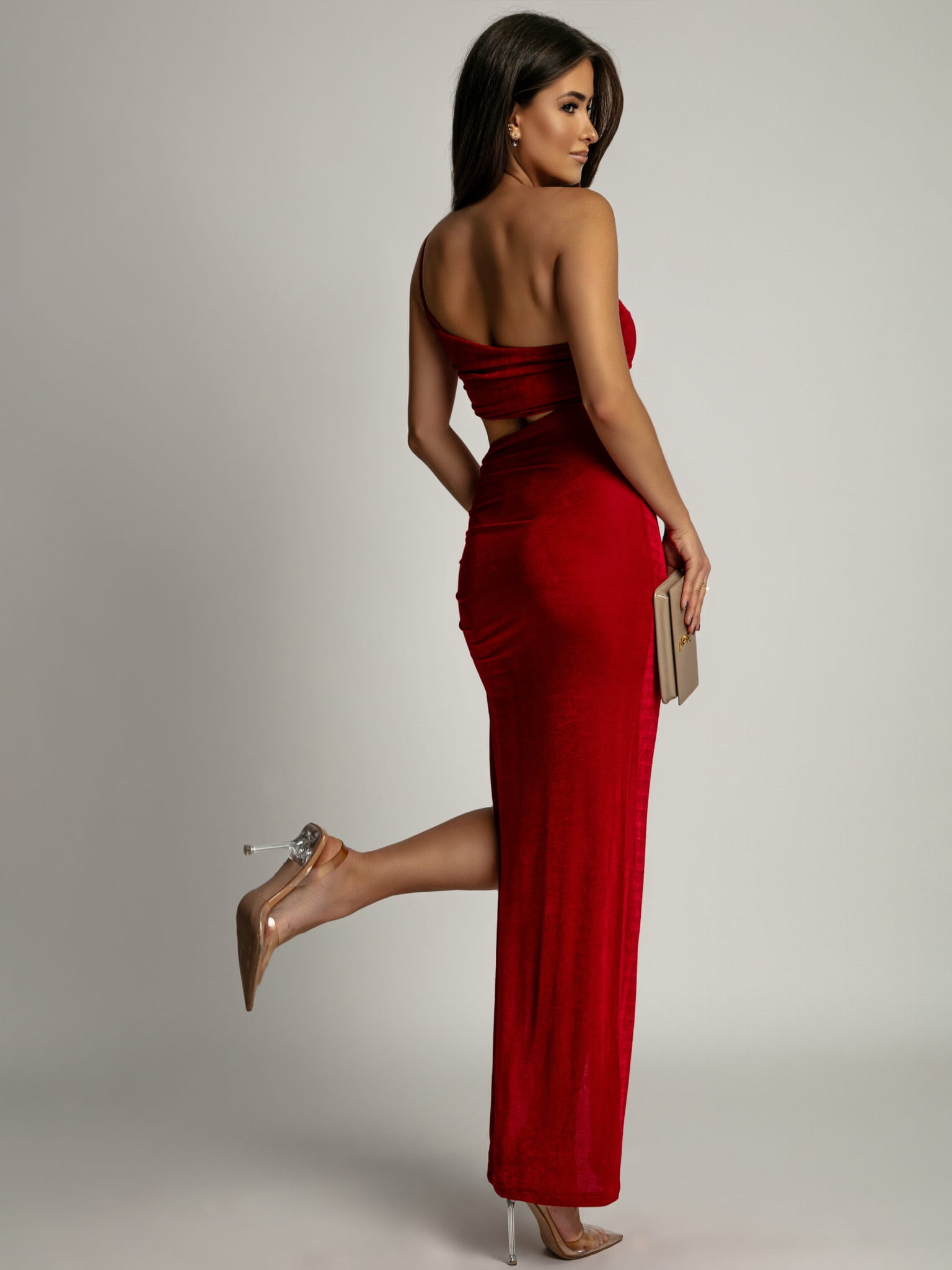 Kobieca sukienka z rozcięciem w talii czerwona PREMIUM