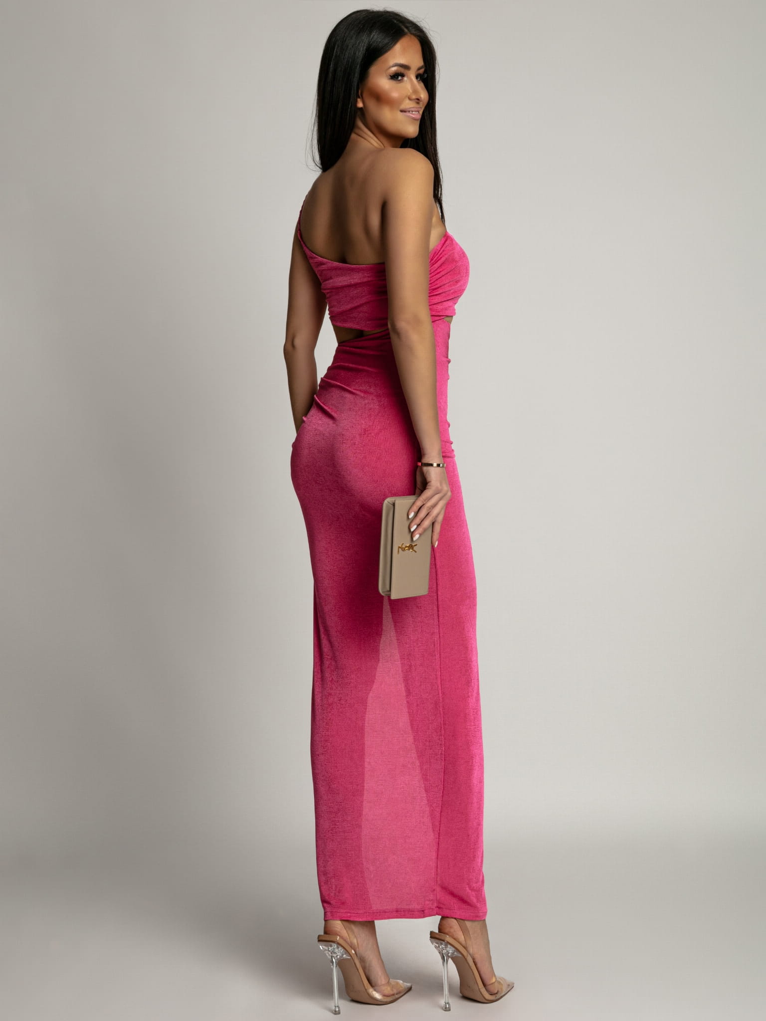 Kobieca sukienka z rozcięciem w talii różowa PREMIUM