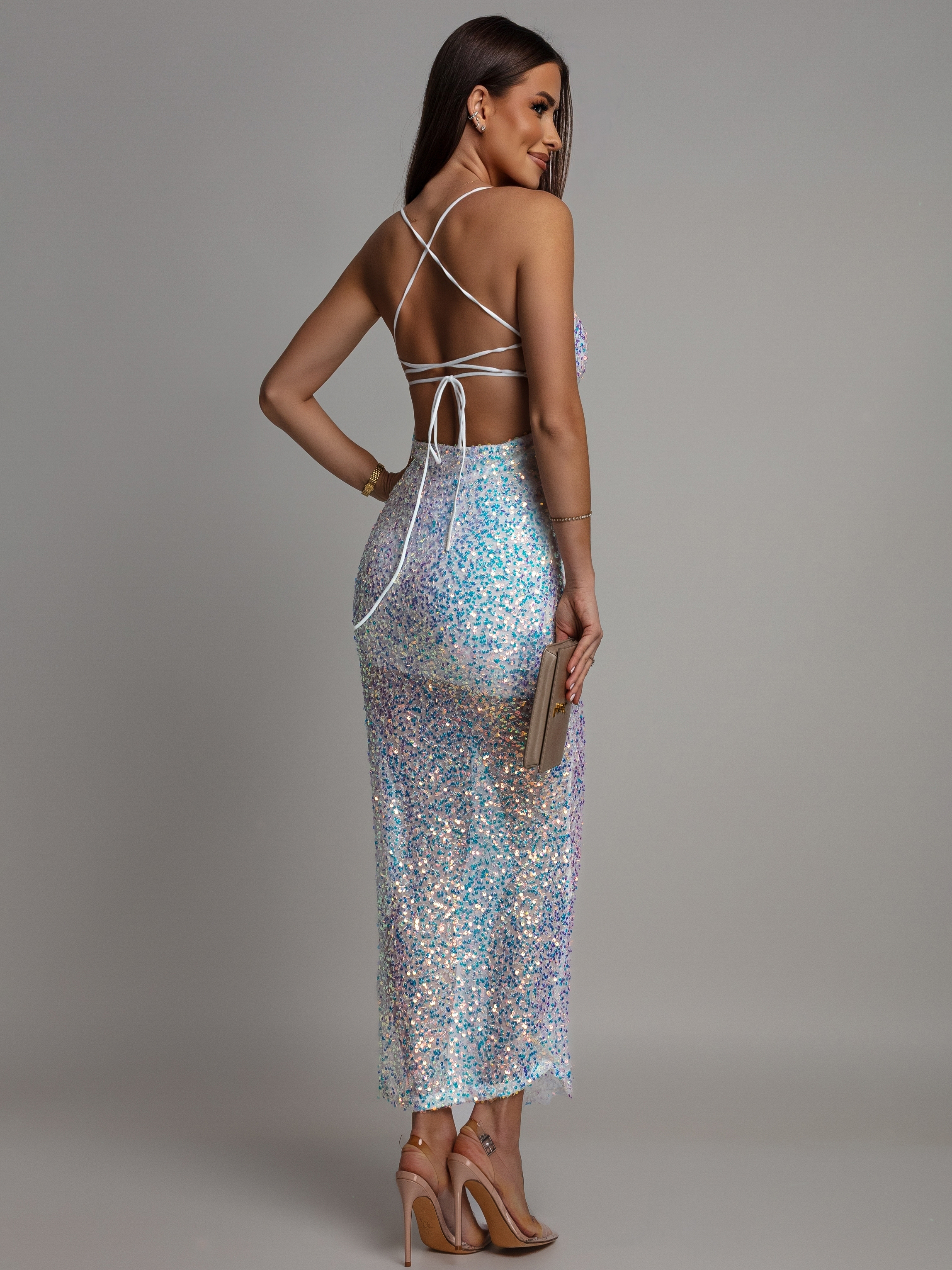 Sukienka cekinowa dwa wiązania na plecach prosty dekolt biała