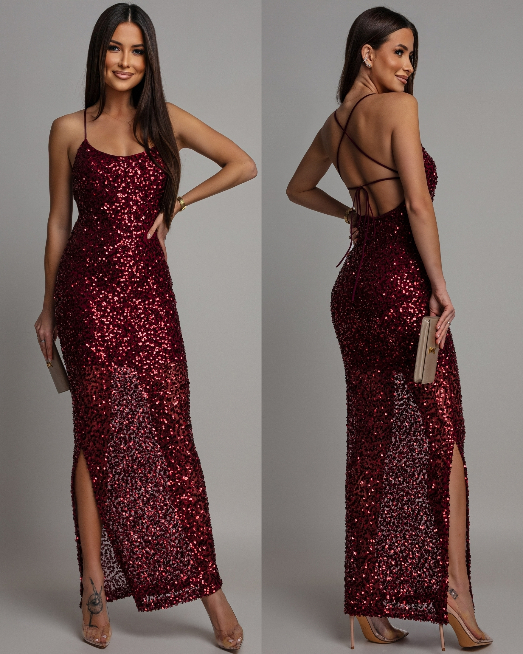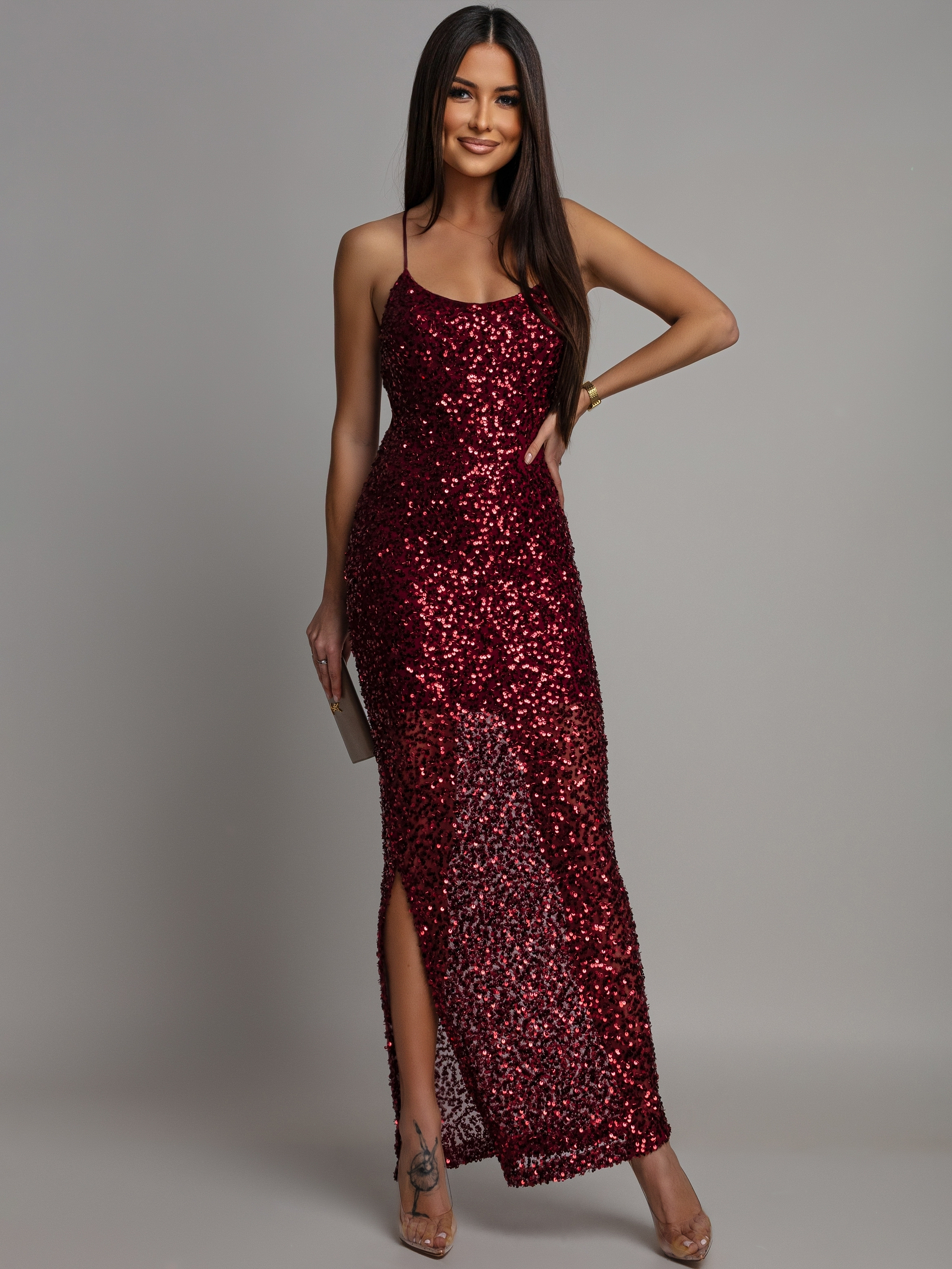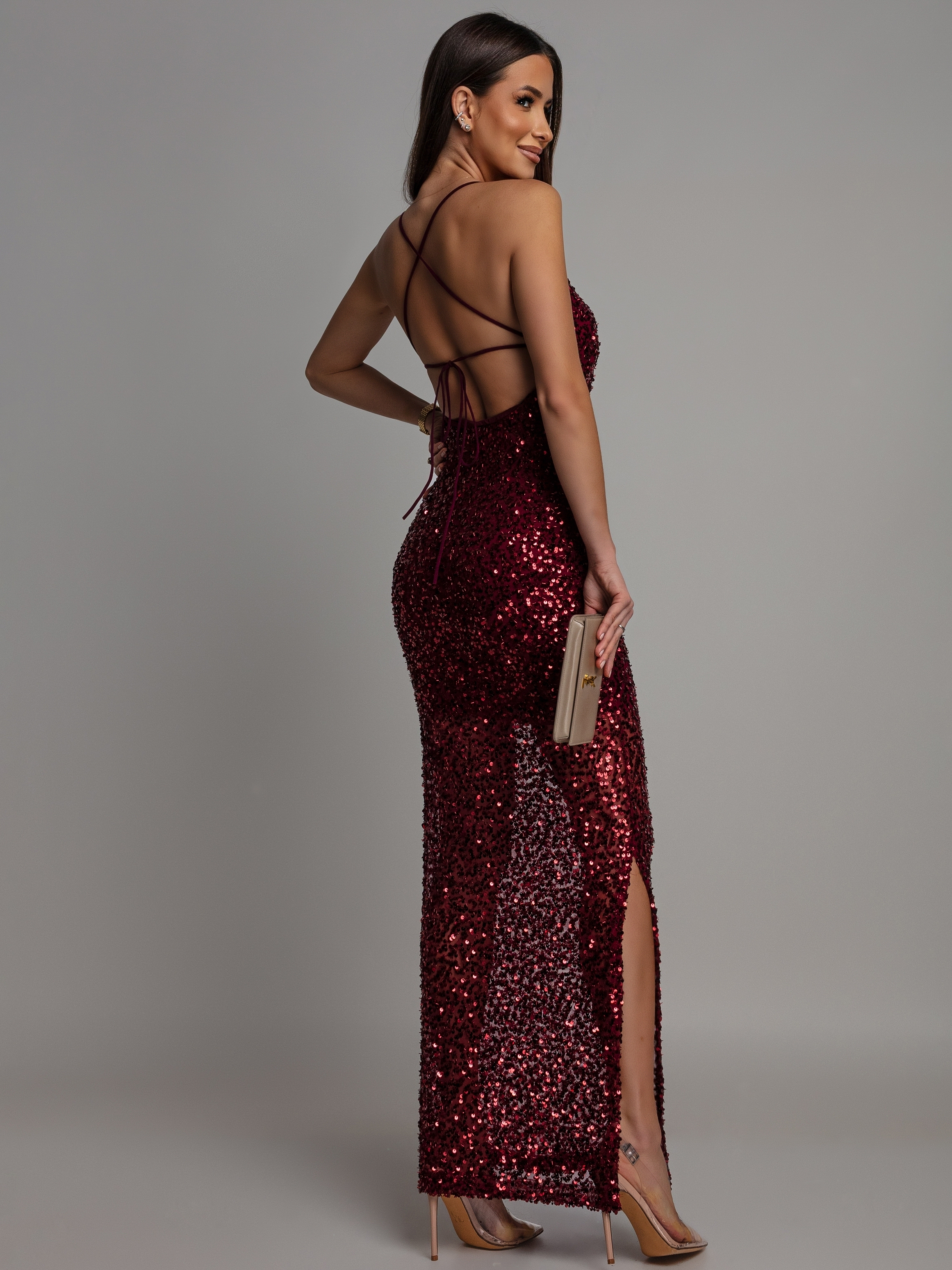 Sukienka cekinowa jedno wiązanie na plecach dekolt łódka bordowa