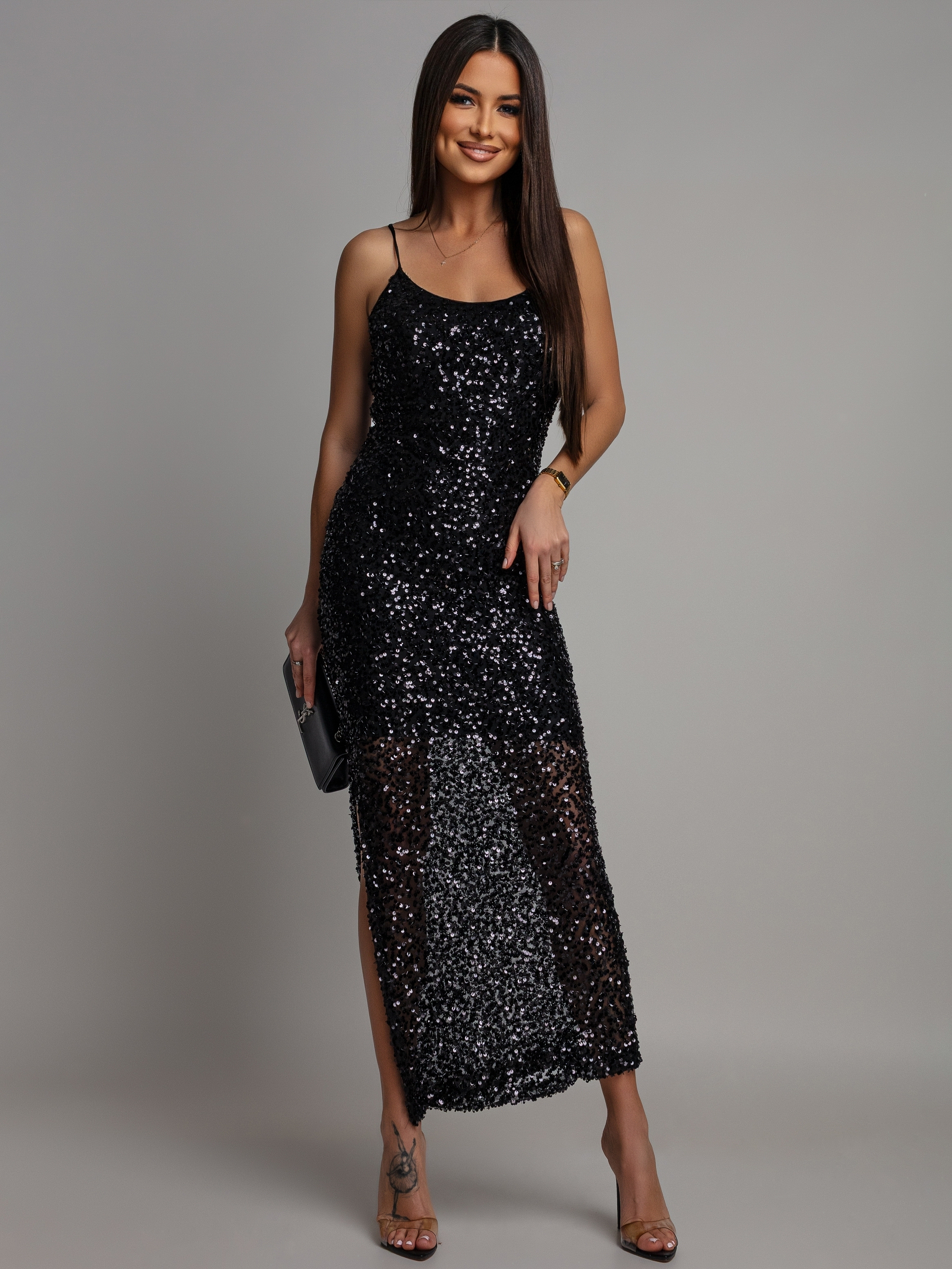 Sukienka cekinowa jedno wiązanie na plecach dekolt łódka czarna