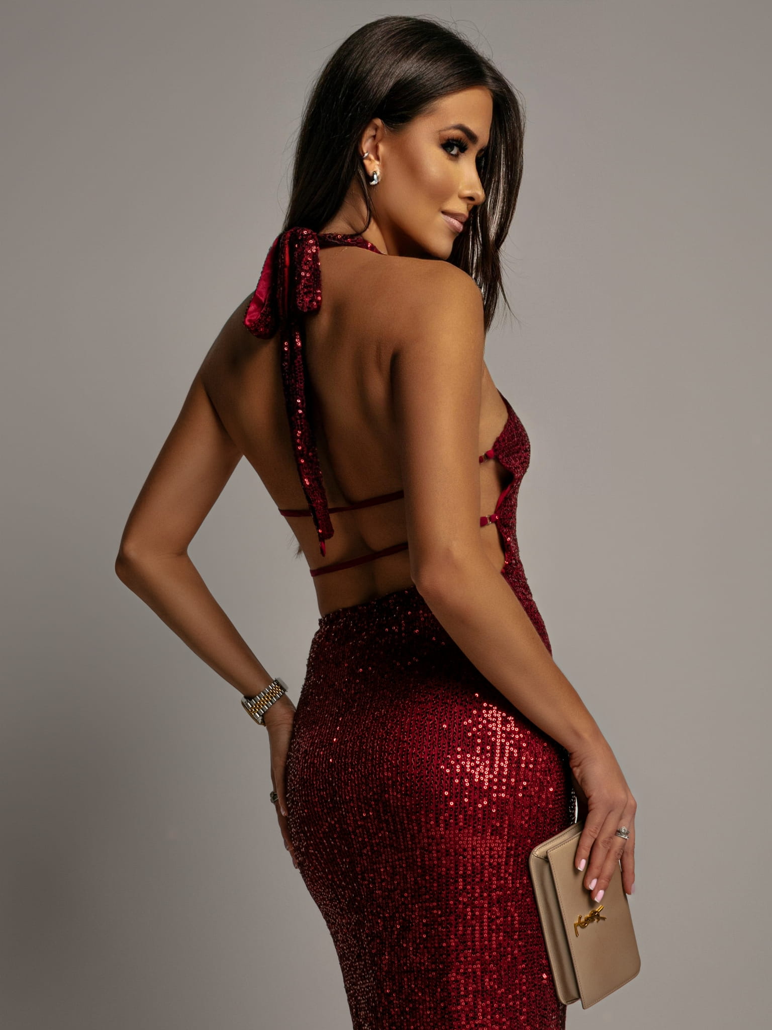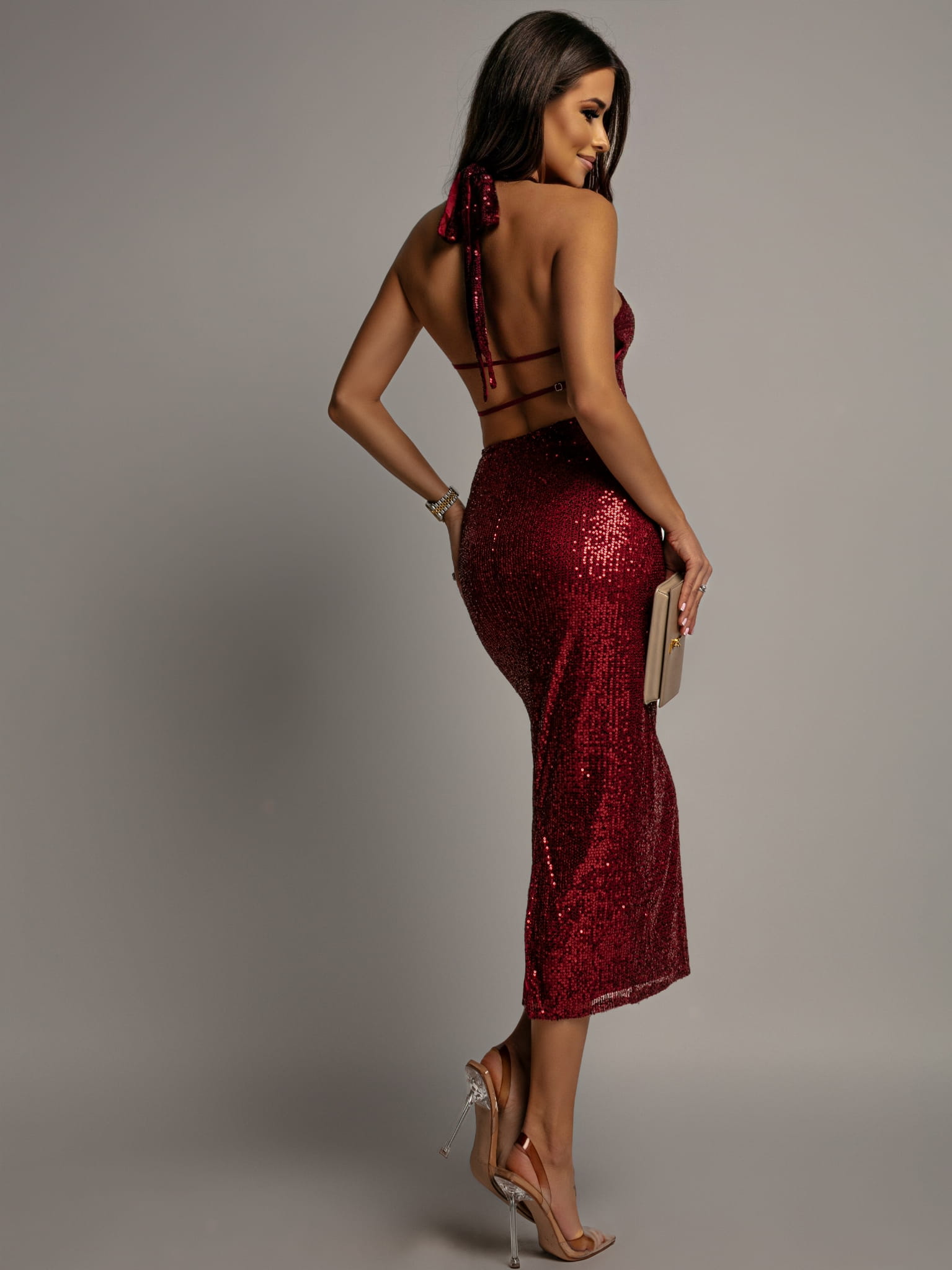 Sukienka cekinowa midi ozdobne plecy bordowa