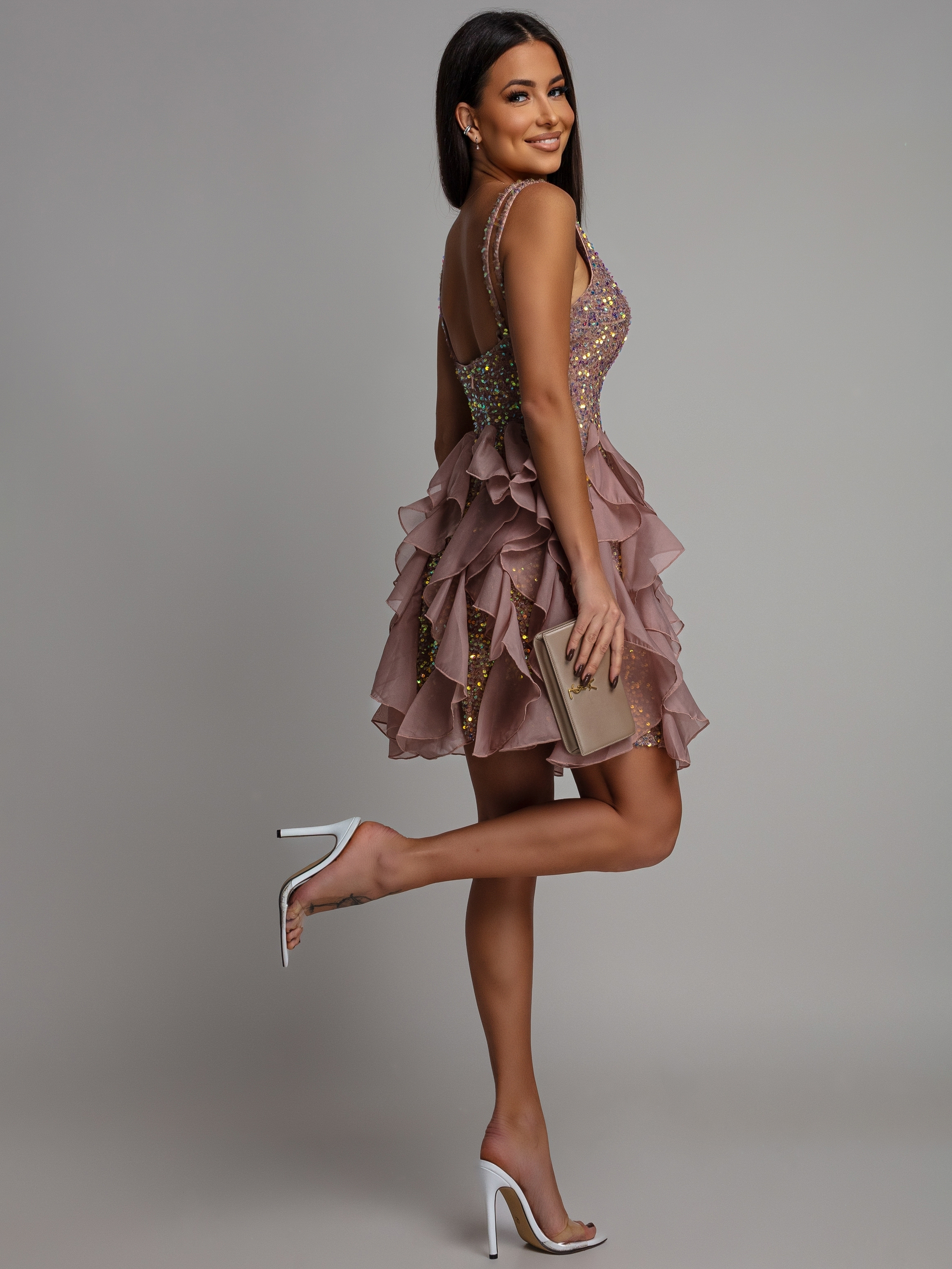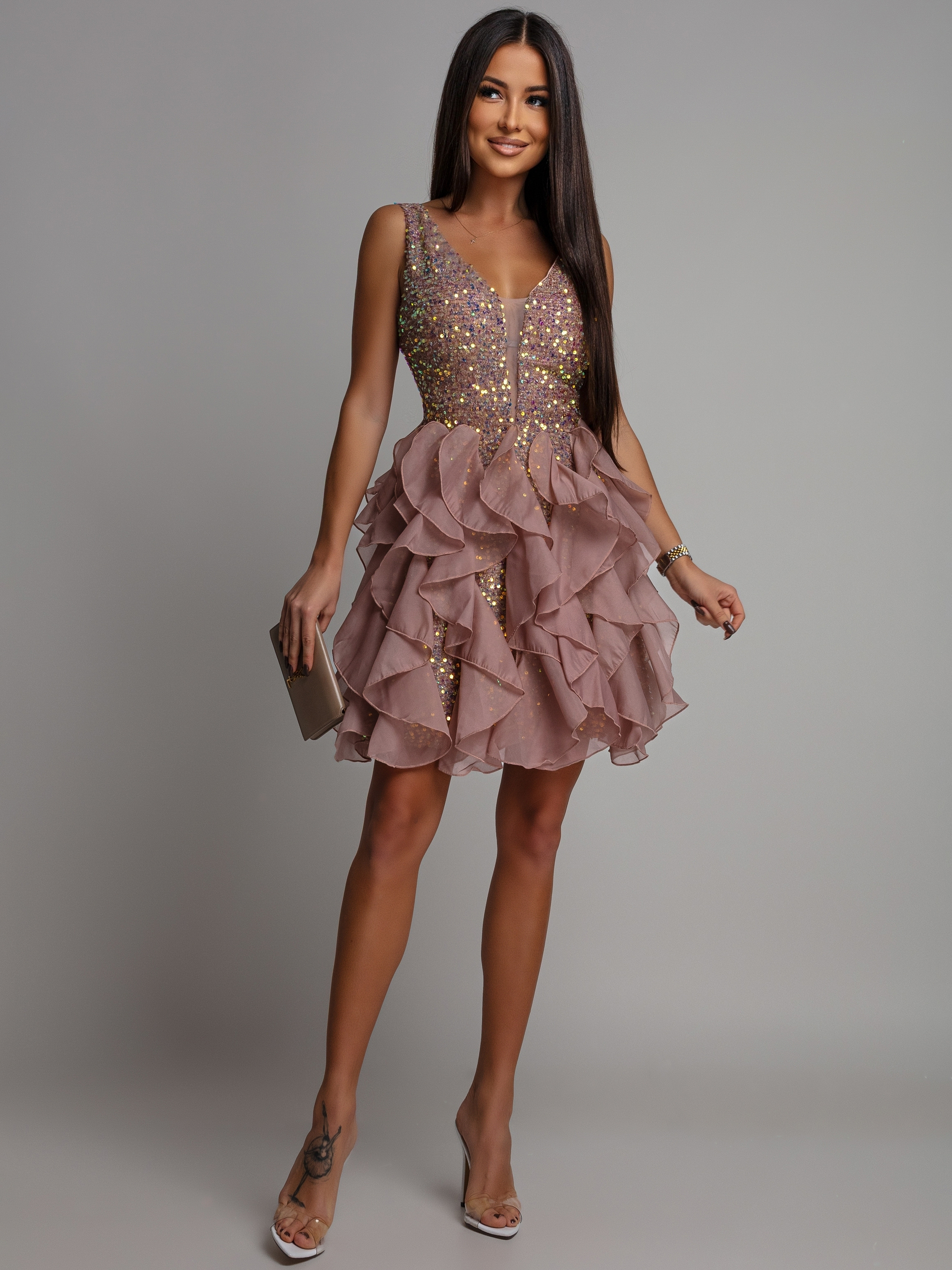 Sukienka cekinowa mini złota z falbankami PREMIUM