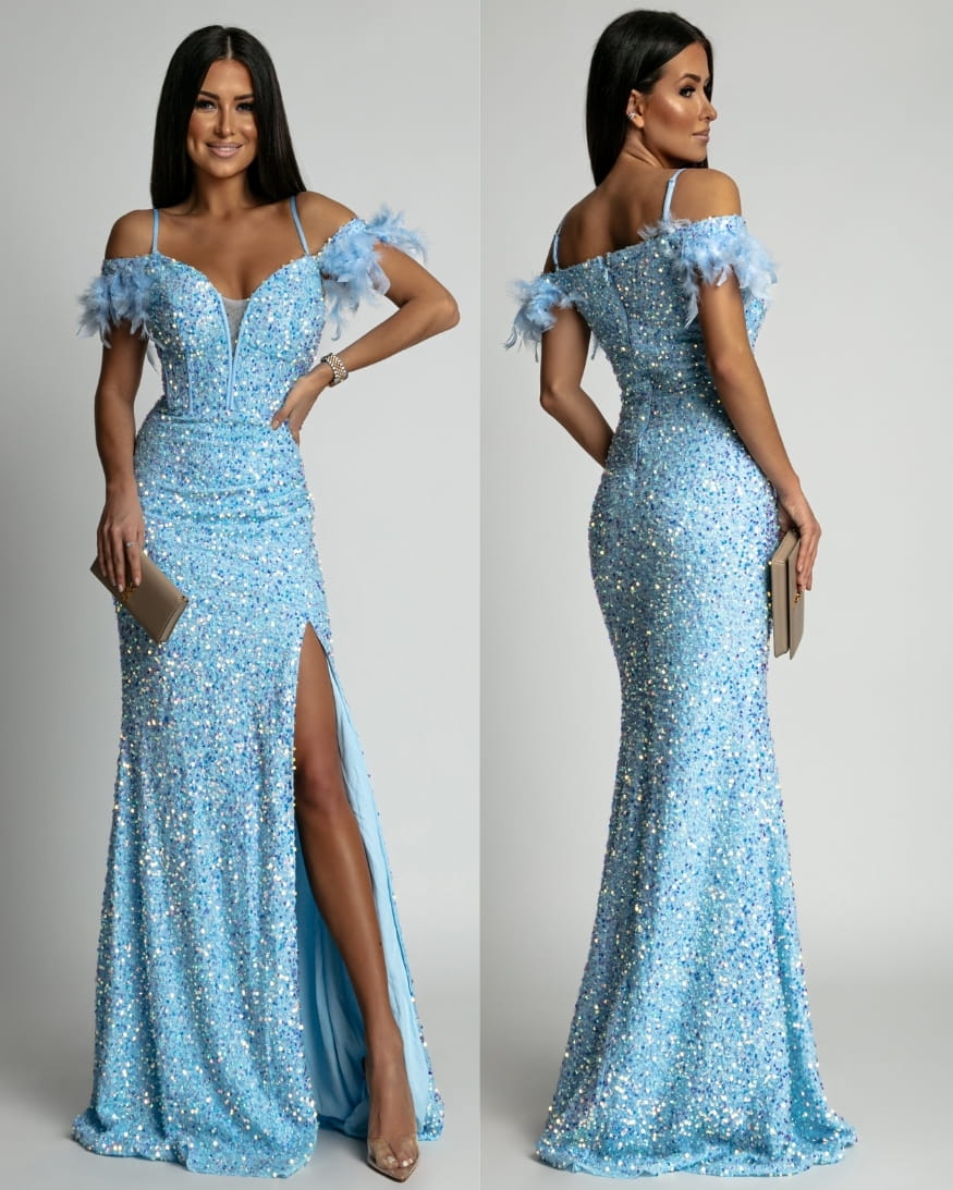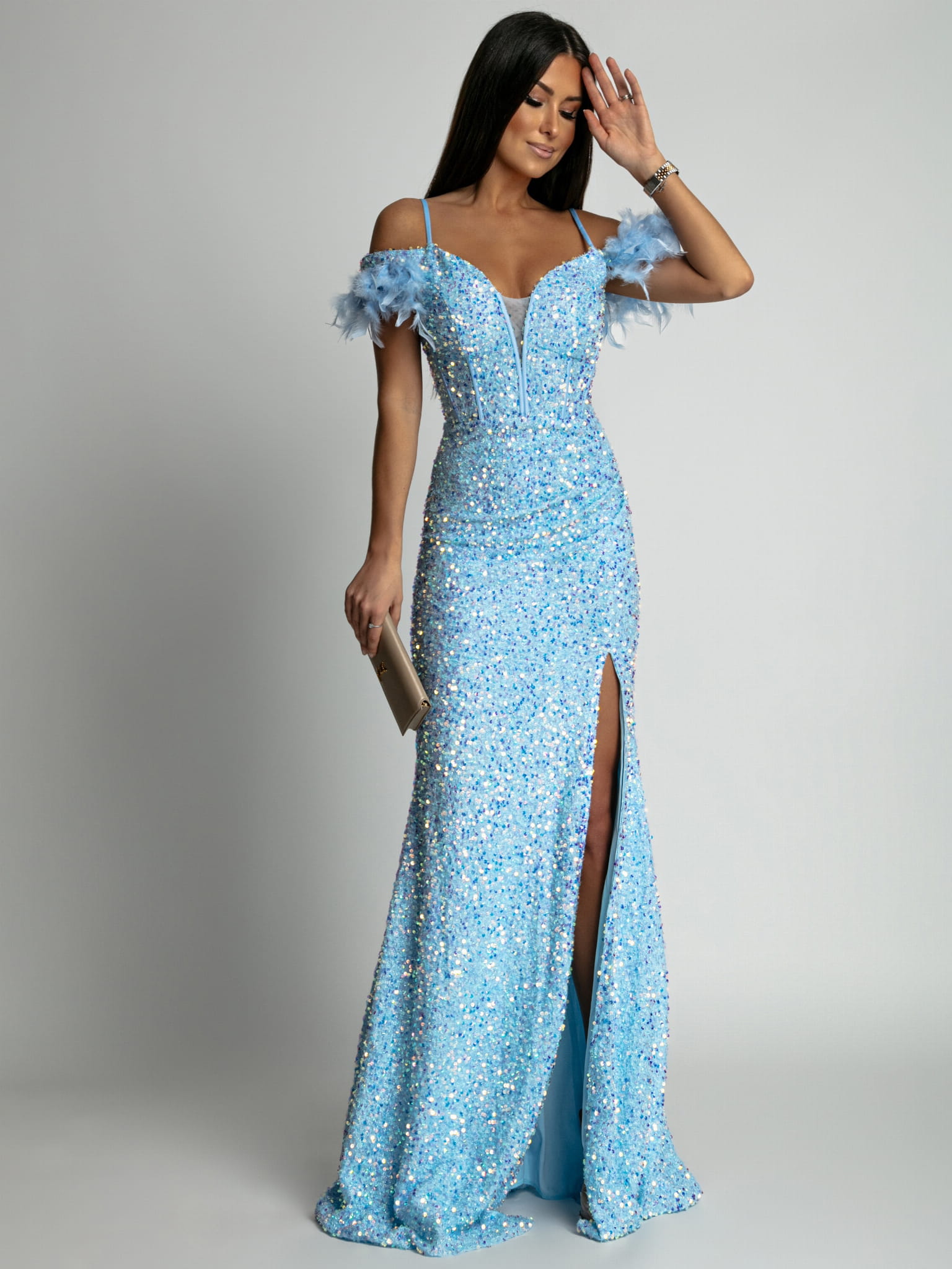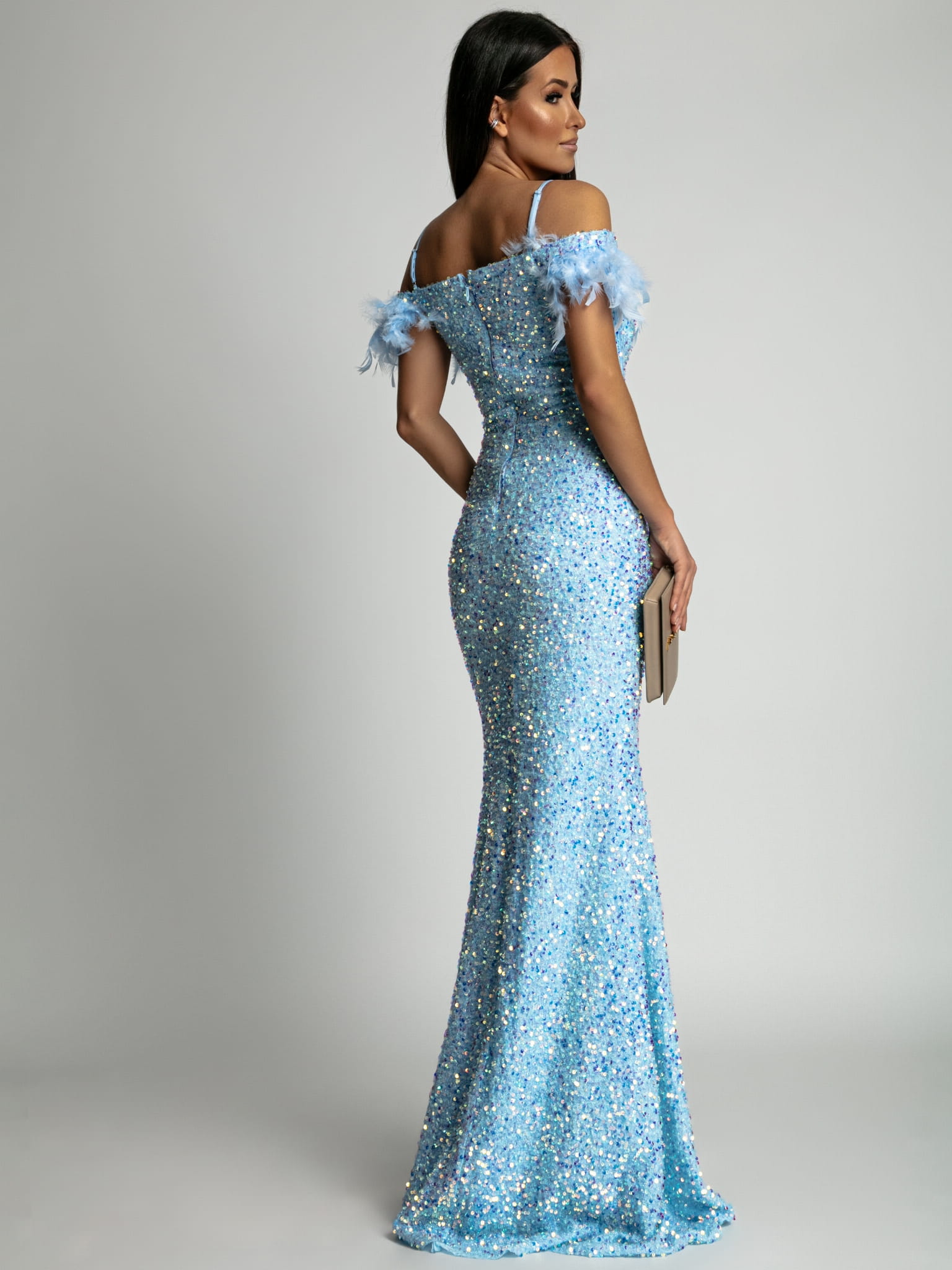 Sukienka długa maxi cekinowa z piórkami niebieska PREMIUM