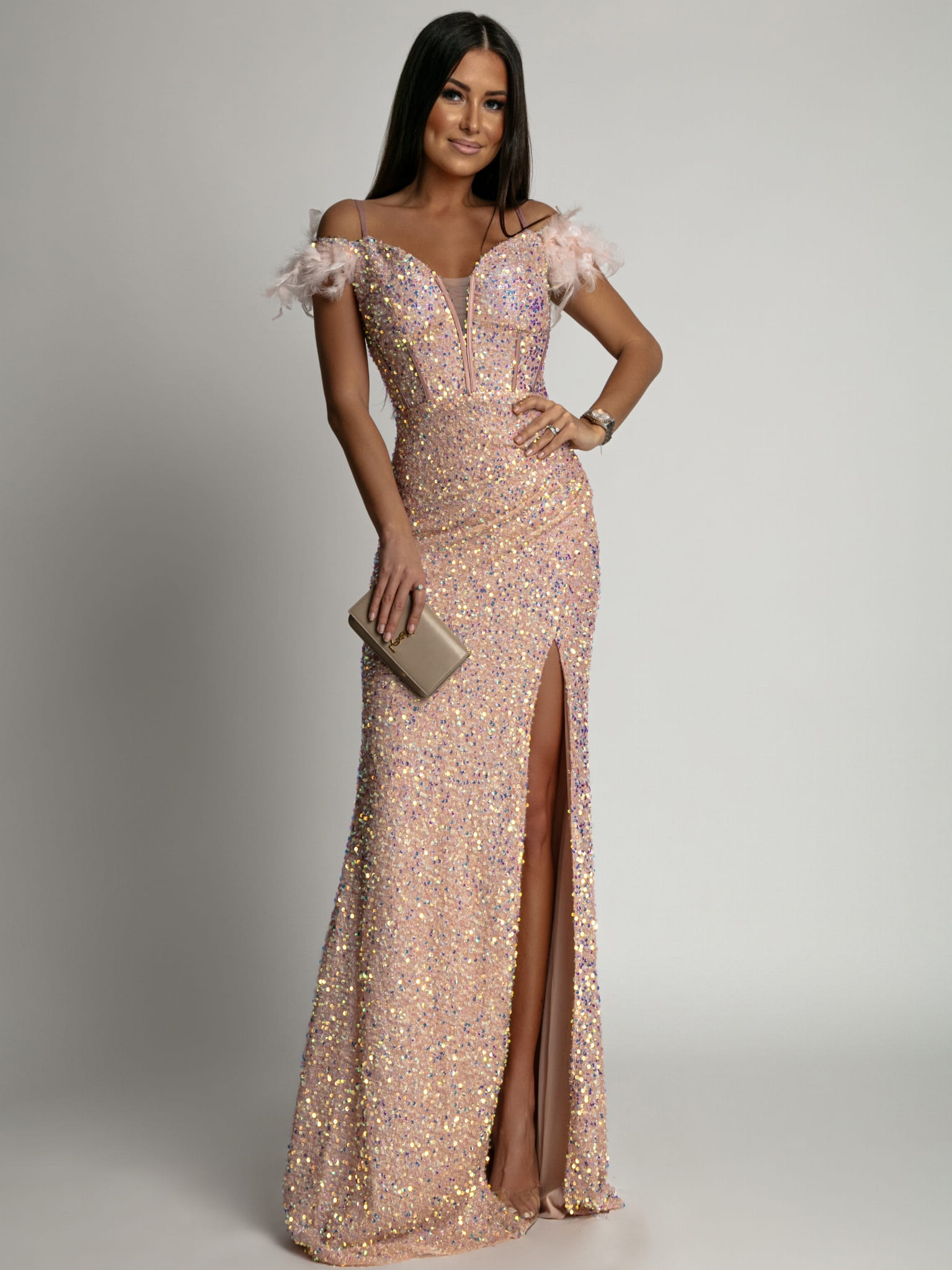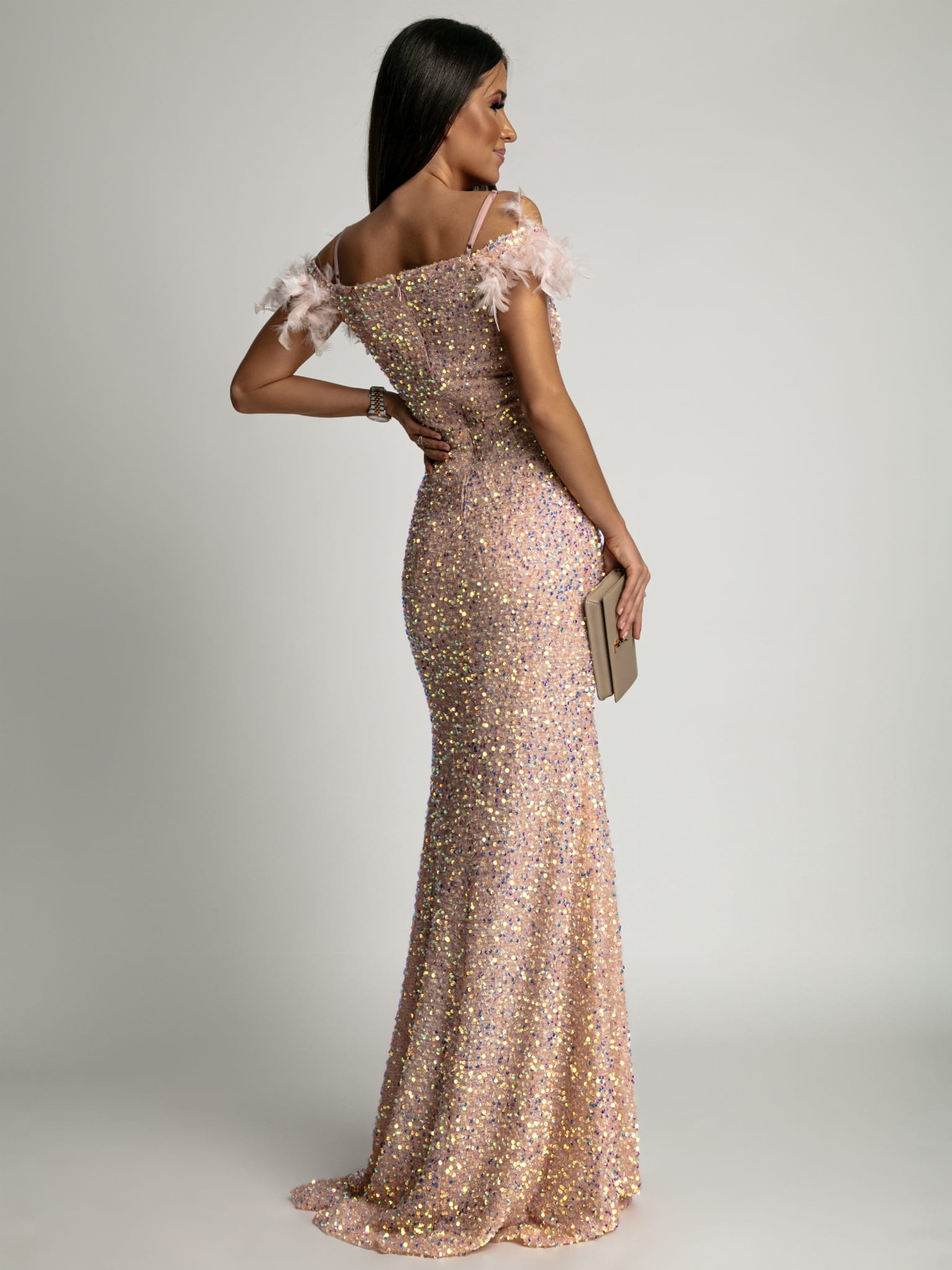 Sukienka długa maxi cekinowa z piórkami pudrowy róż PREMIUM