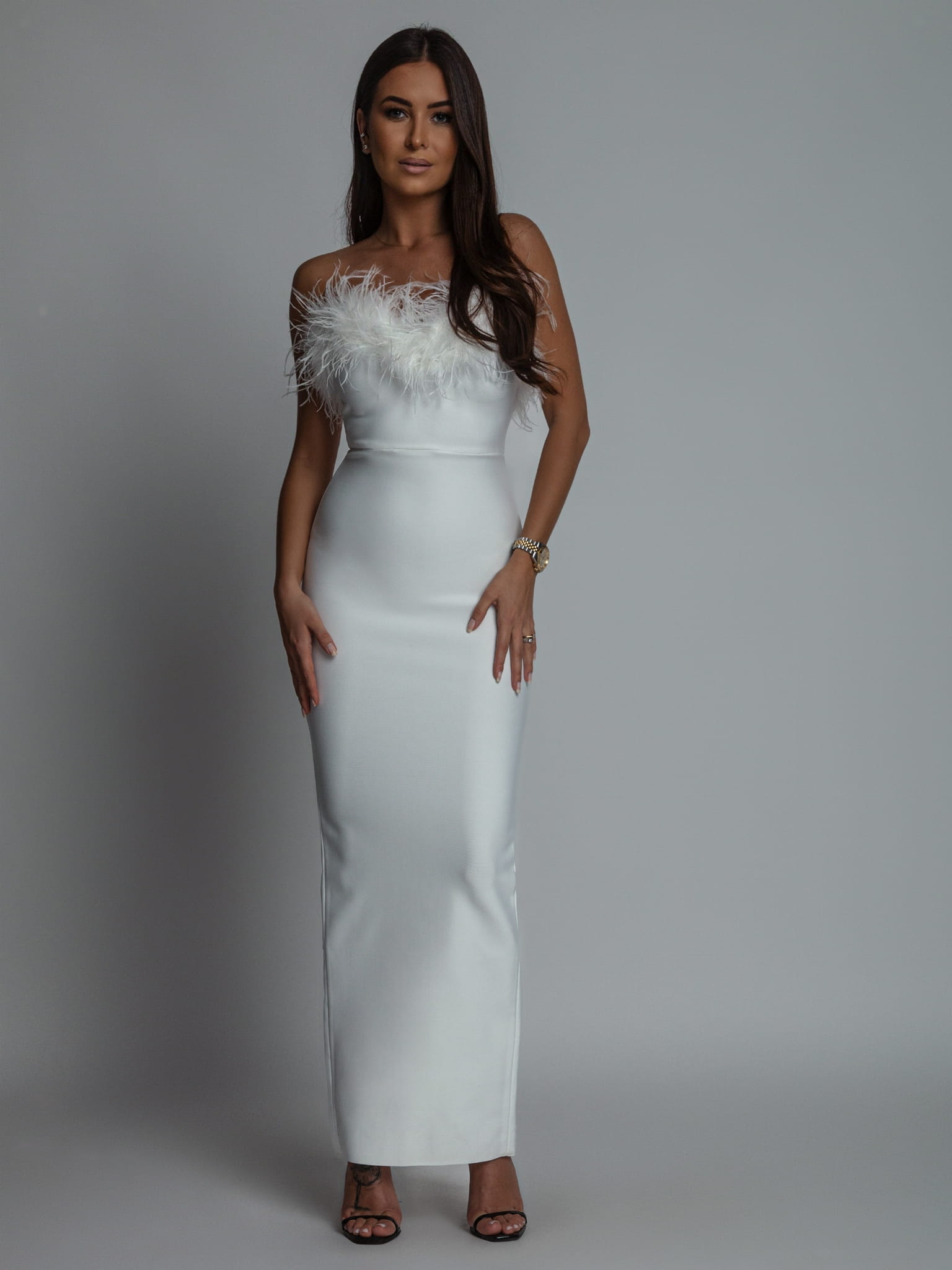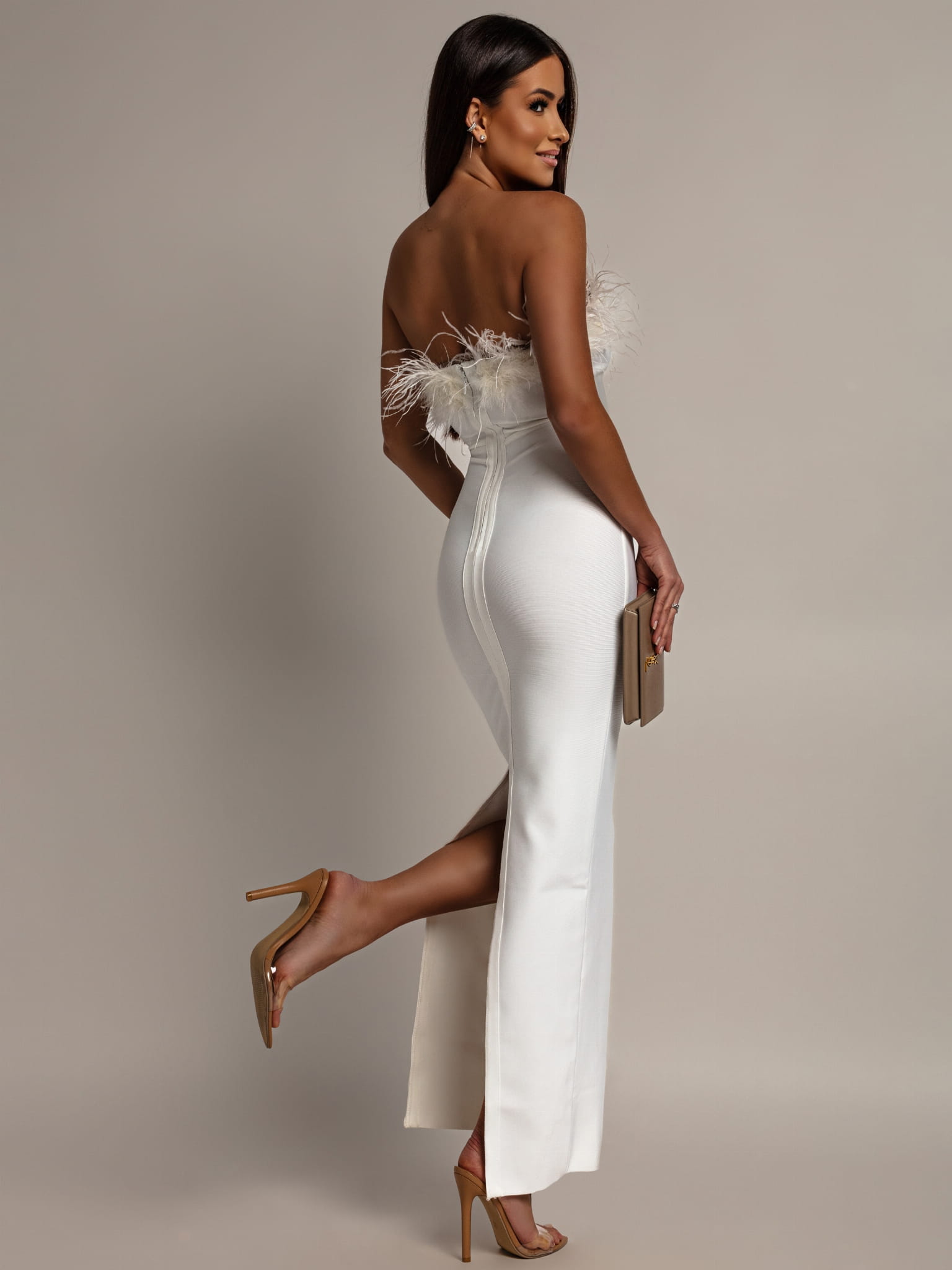 Sukienka długa z piórkami na dekolcie bandażowa PREMIUM biała