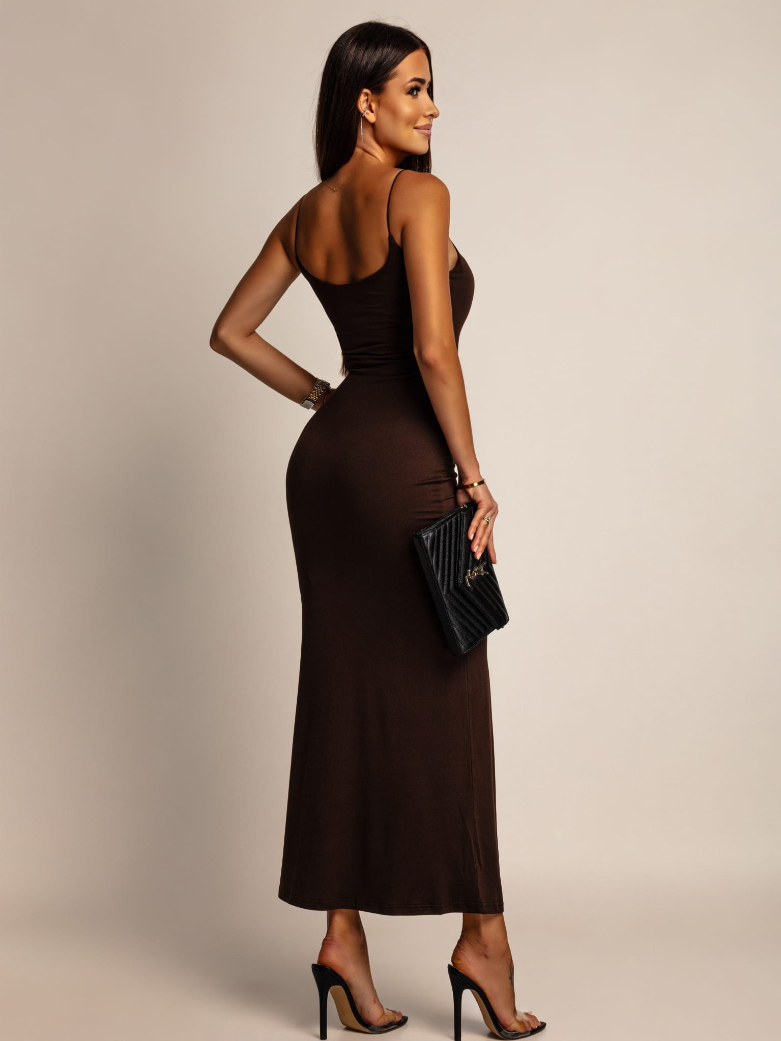 Sukienka klasyczna midi na ramiączkach czekolada PREMIUM Polska produkcja