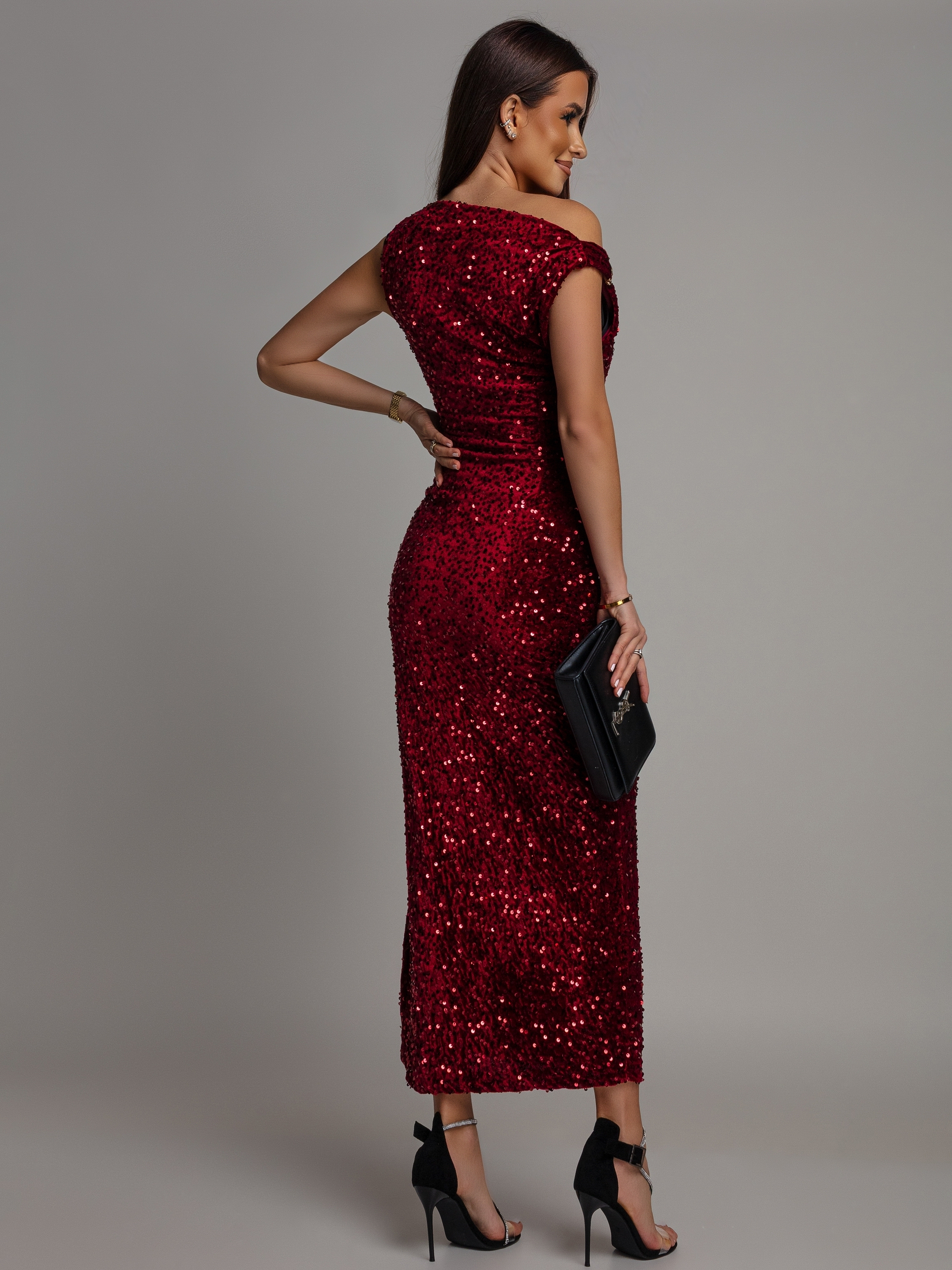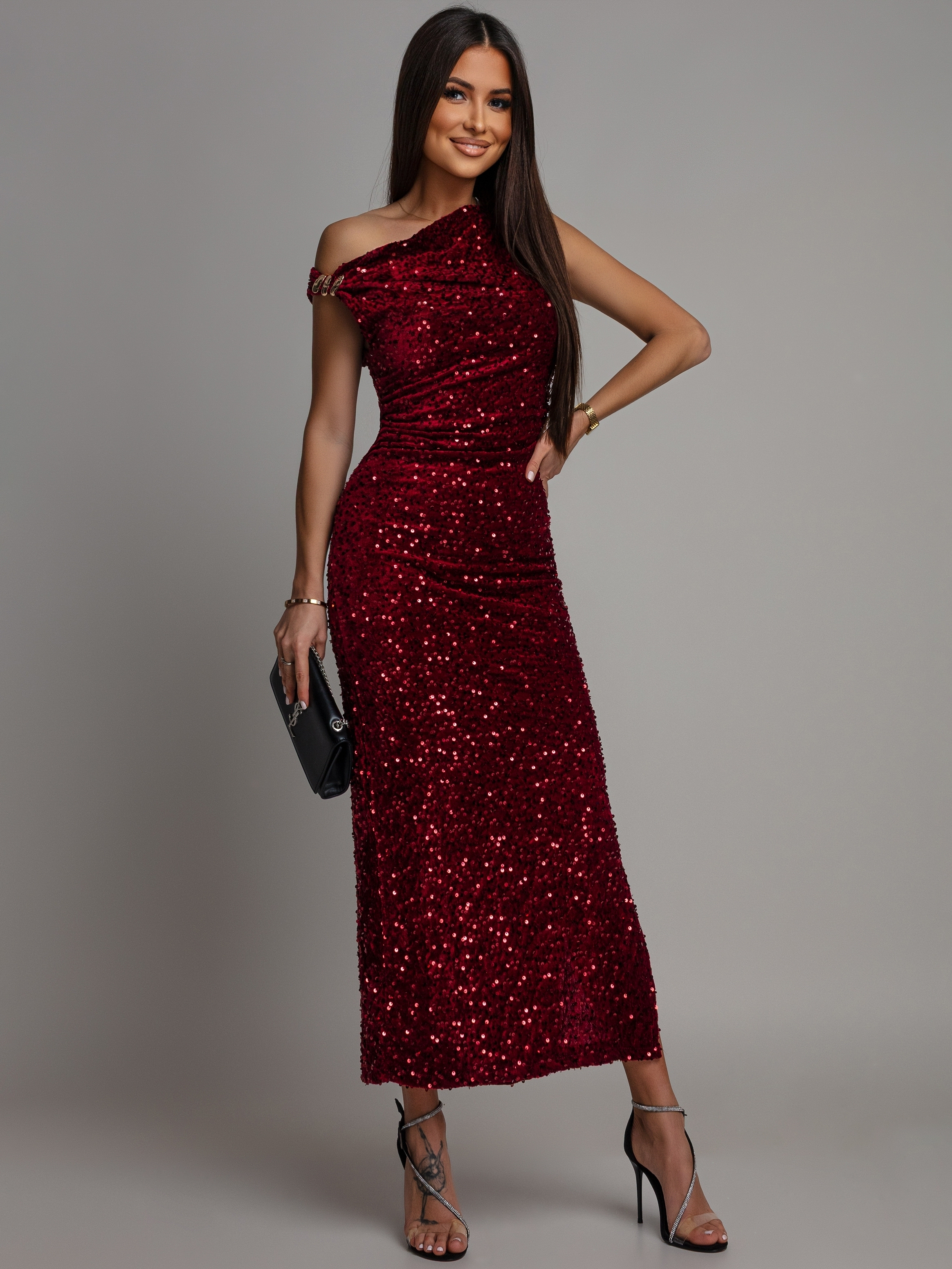 Sukienka midi opadające ozdobne ramiączko bordowa