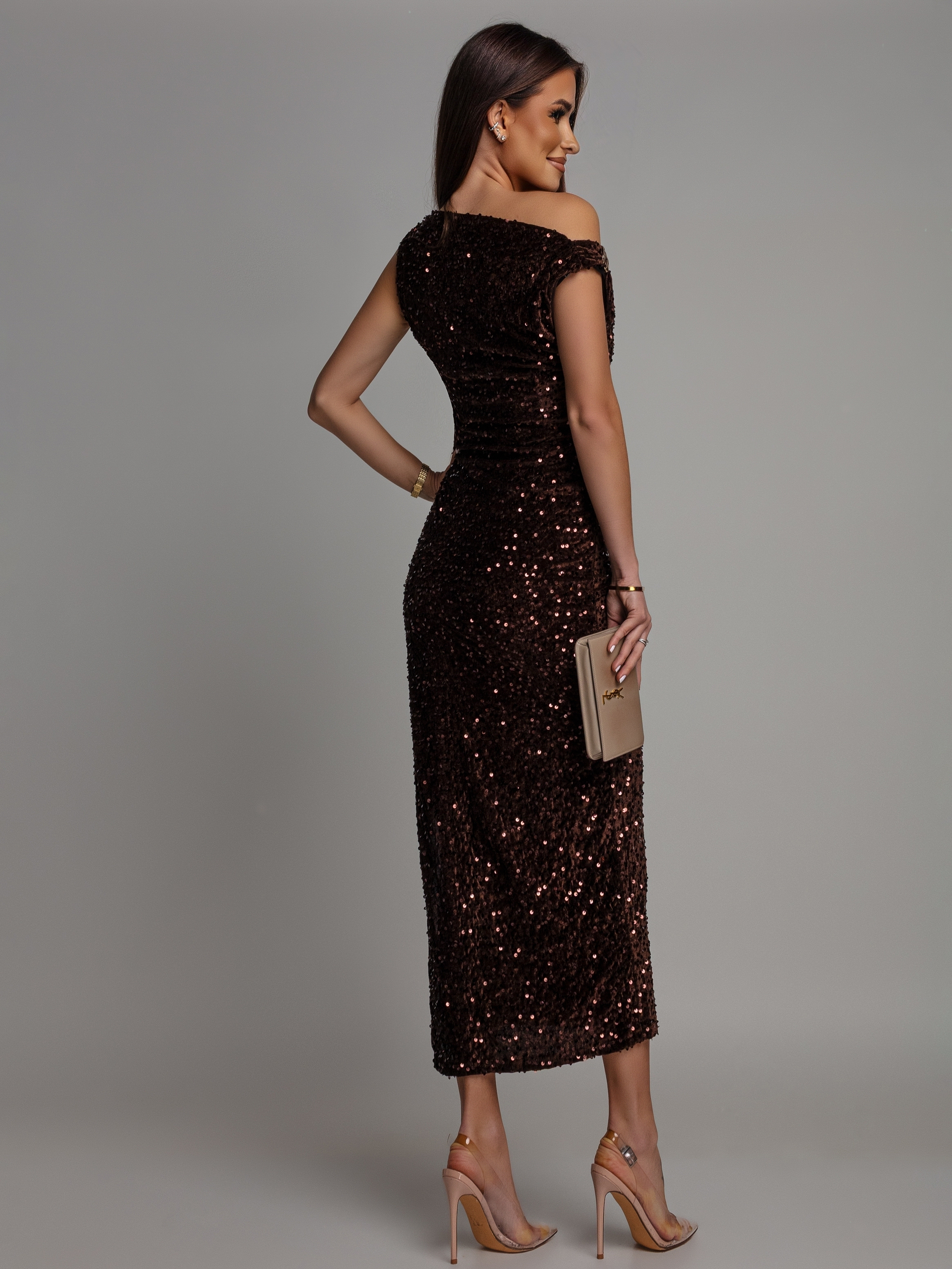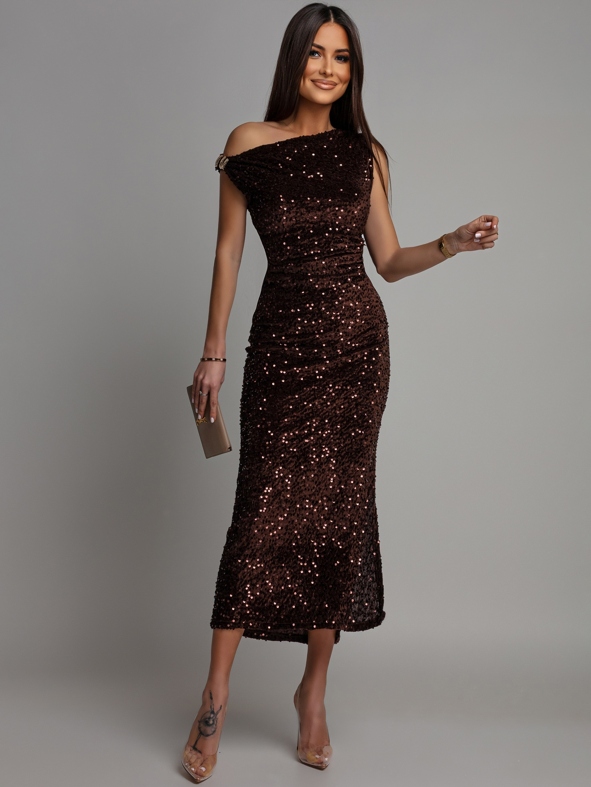 Sukienka midi opadające ozdobne ramiączko czekoladowa