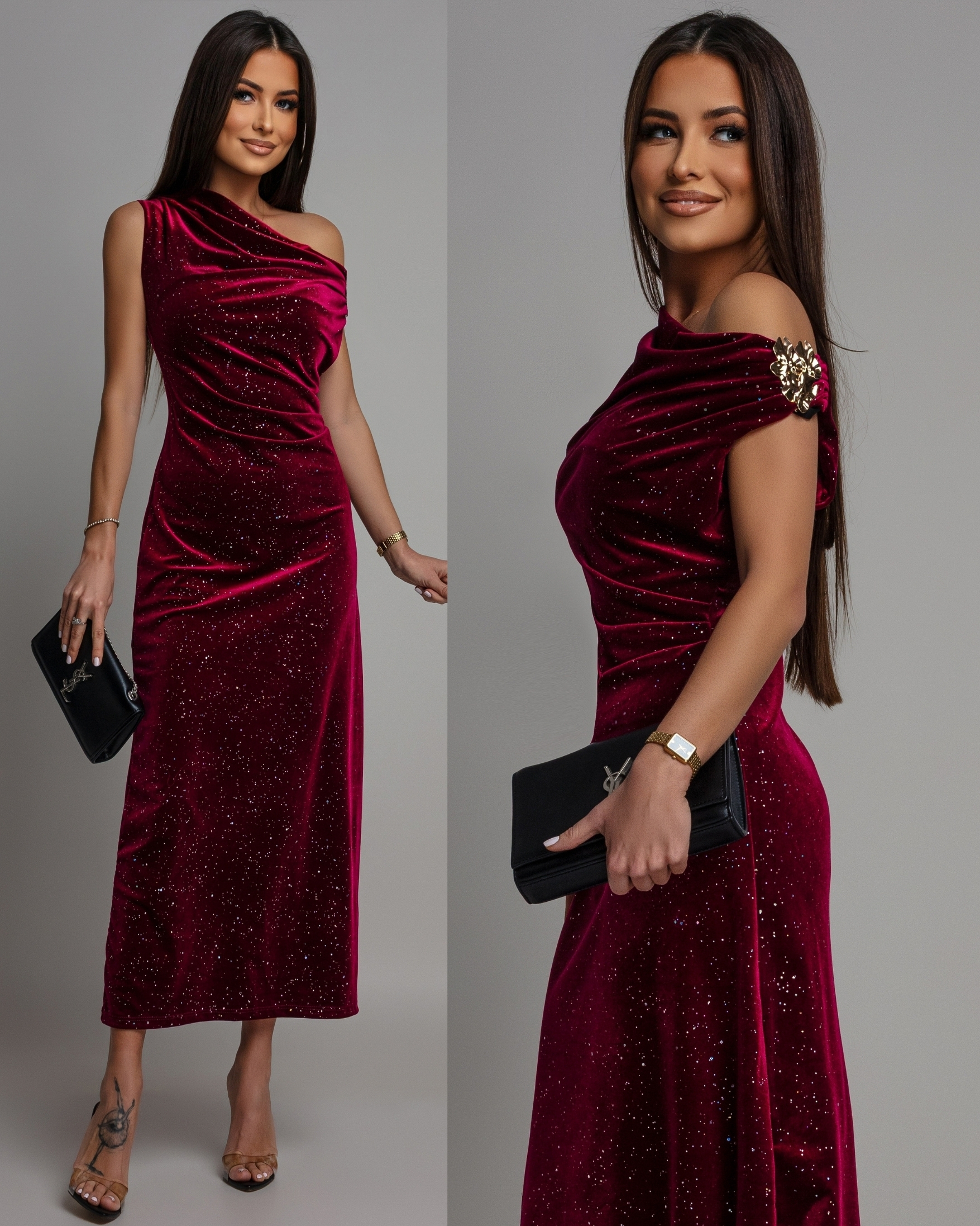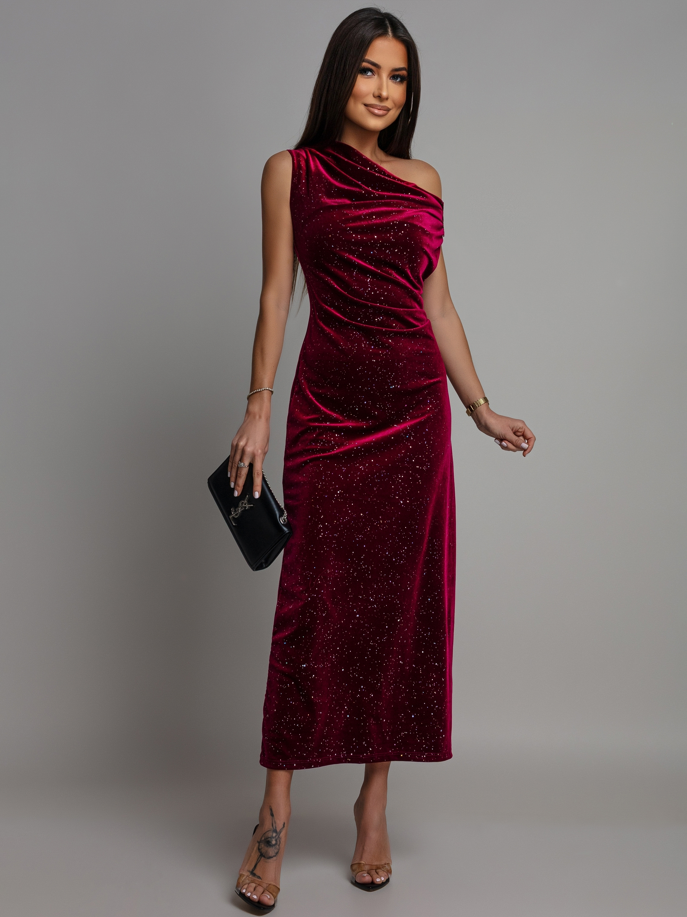 Sukienka midi welurowa opadające ramię bordowa