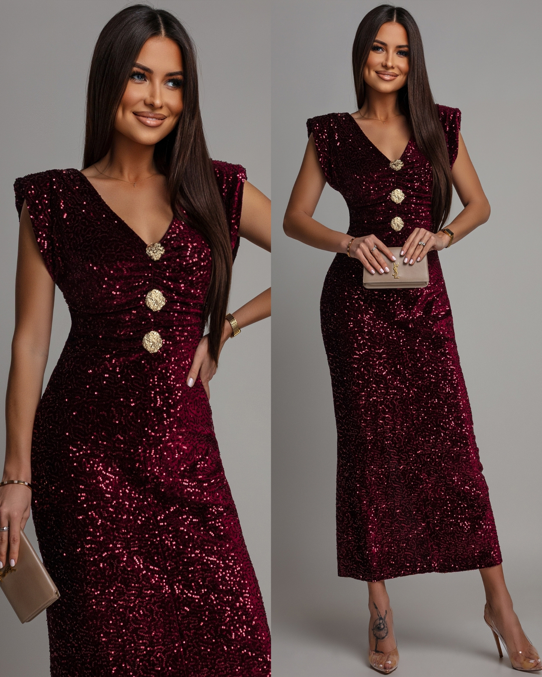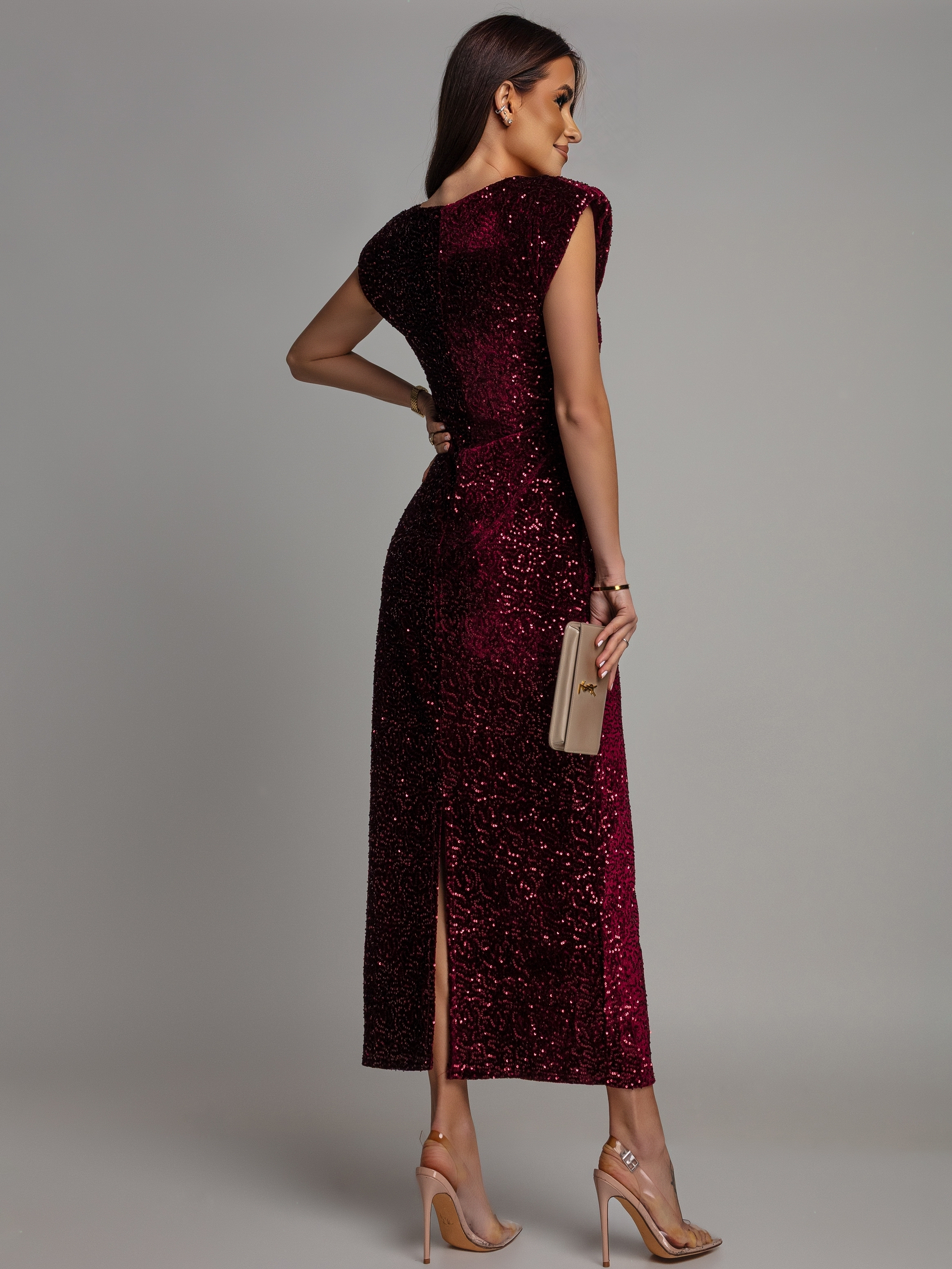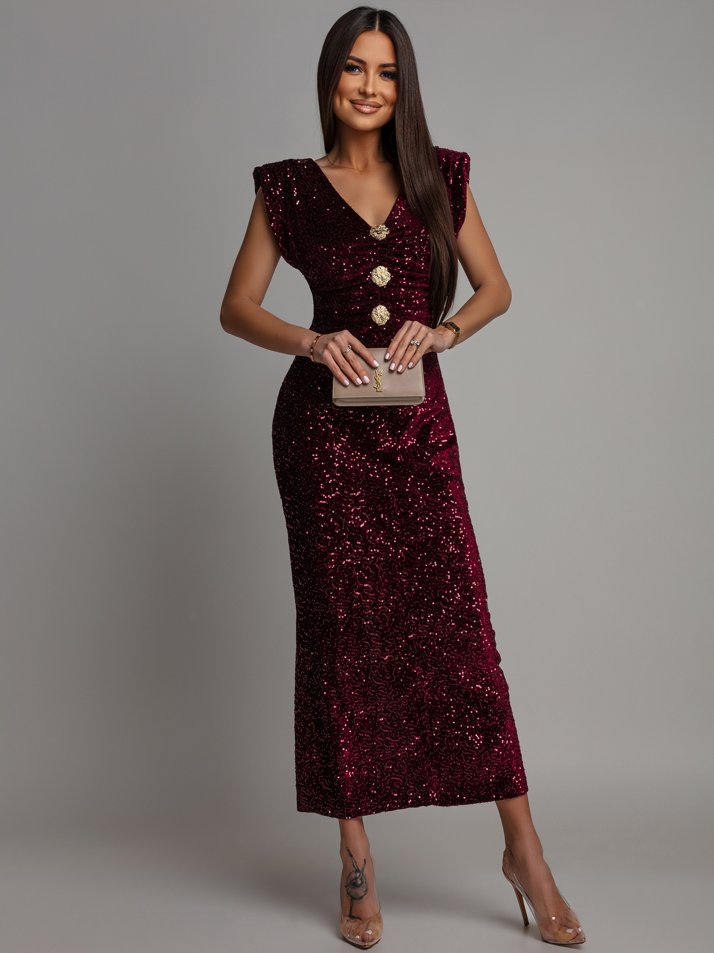 Sukienka midi z ozdobnymi broszkami cekinowa bordowa