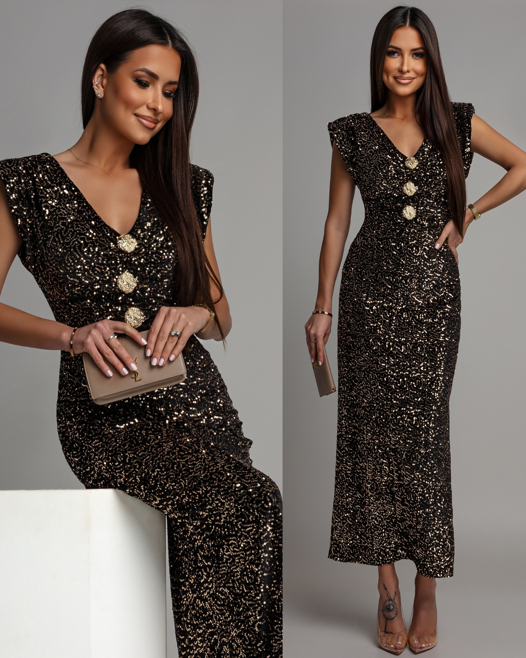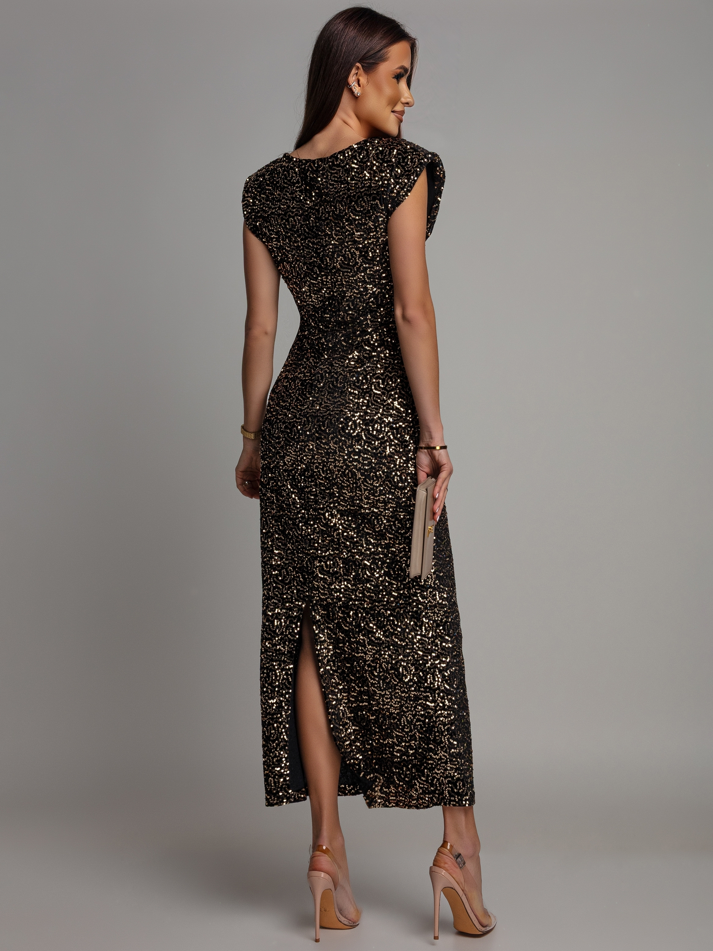 Sukienka midi z ozdobnymi broszkami cekinowa złota