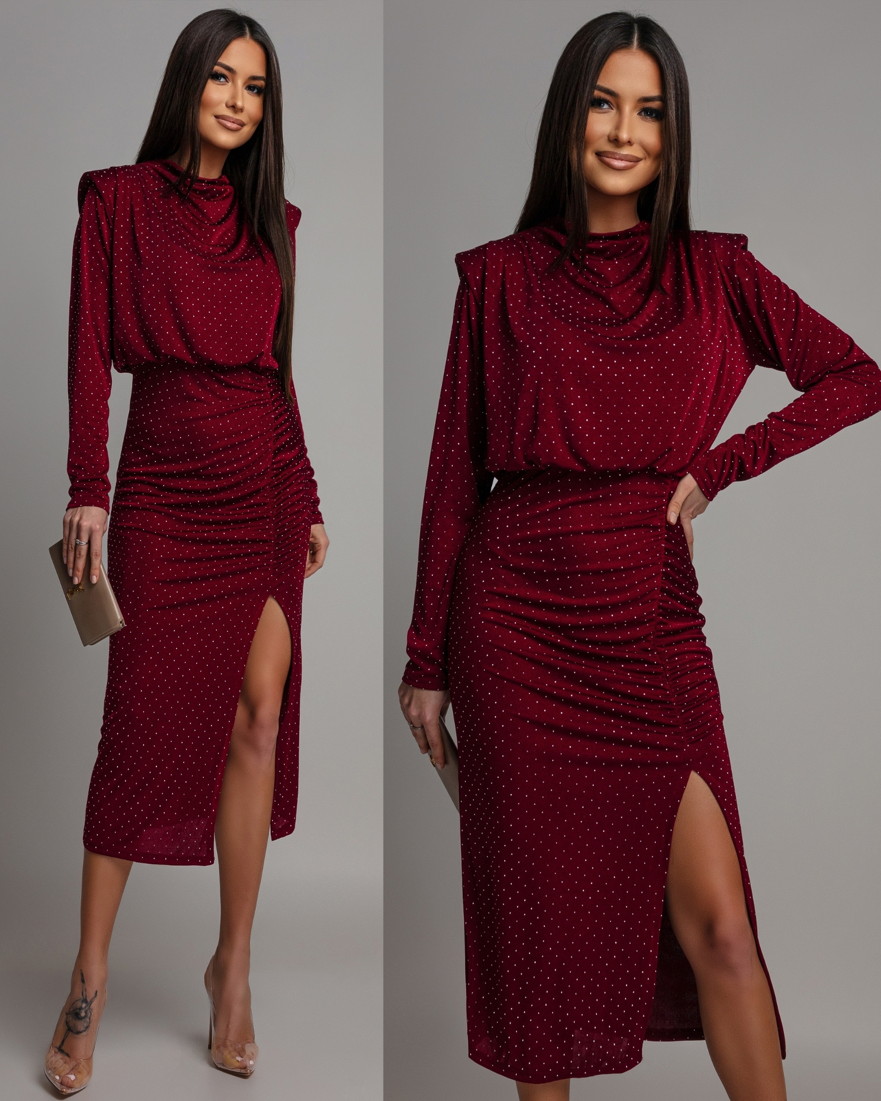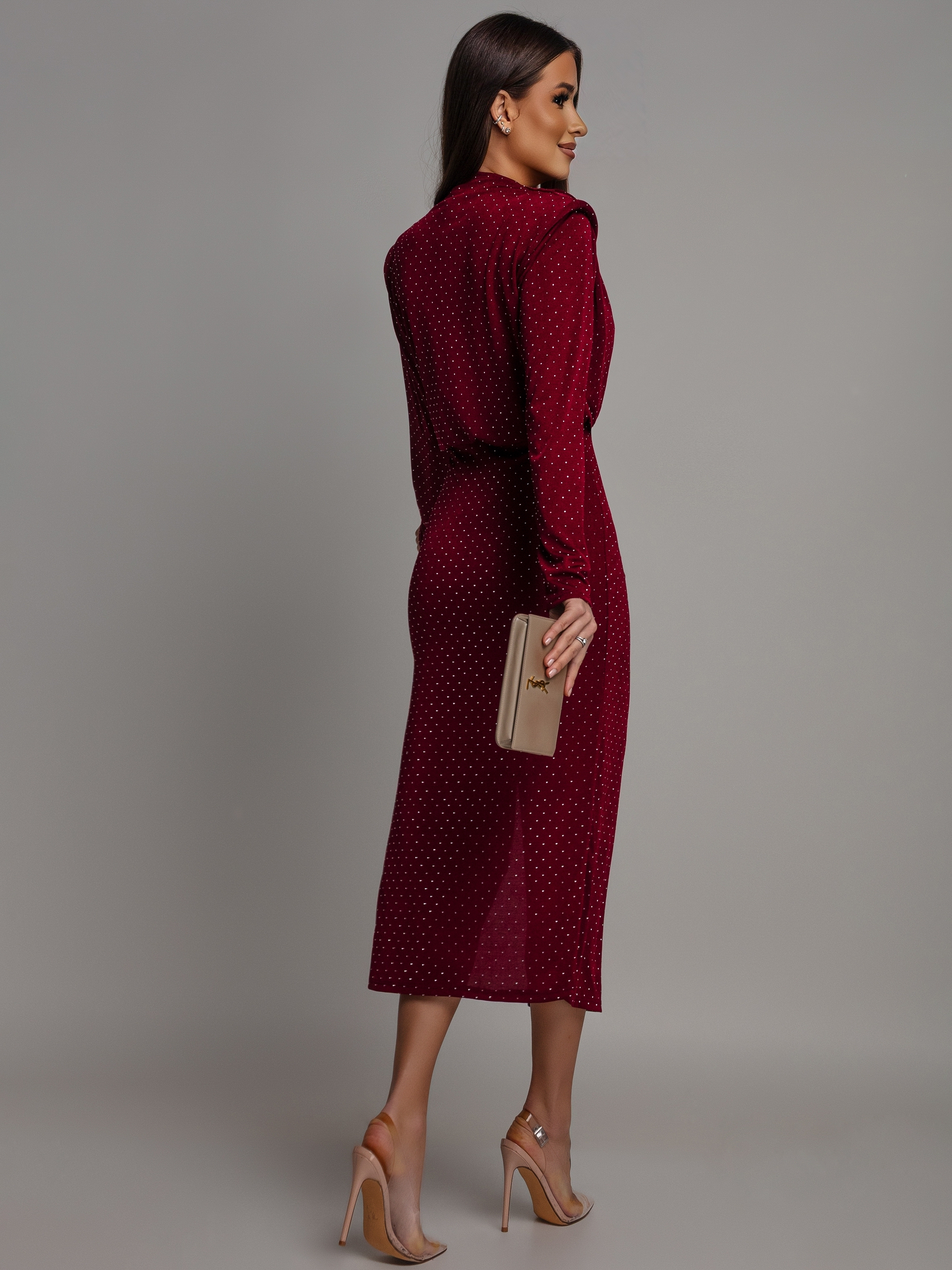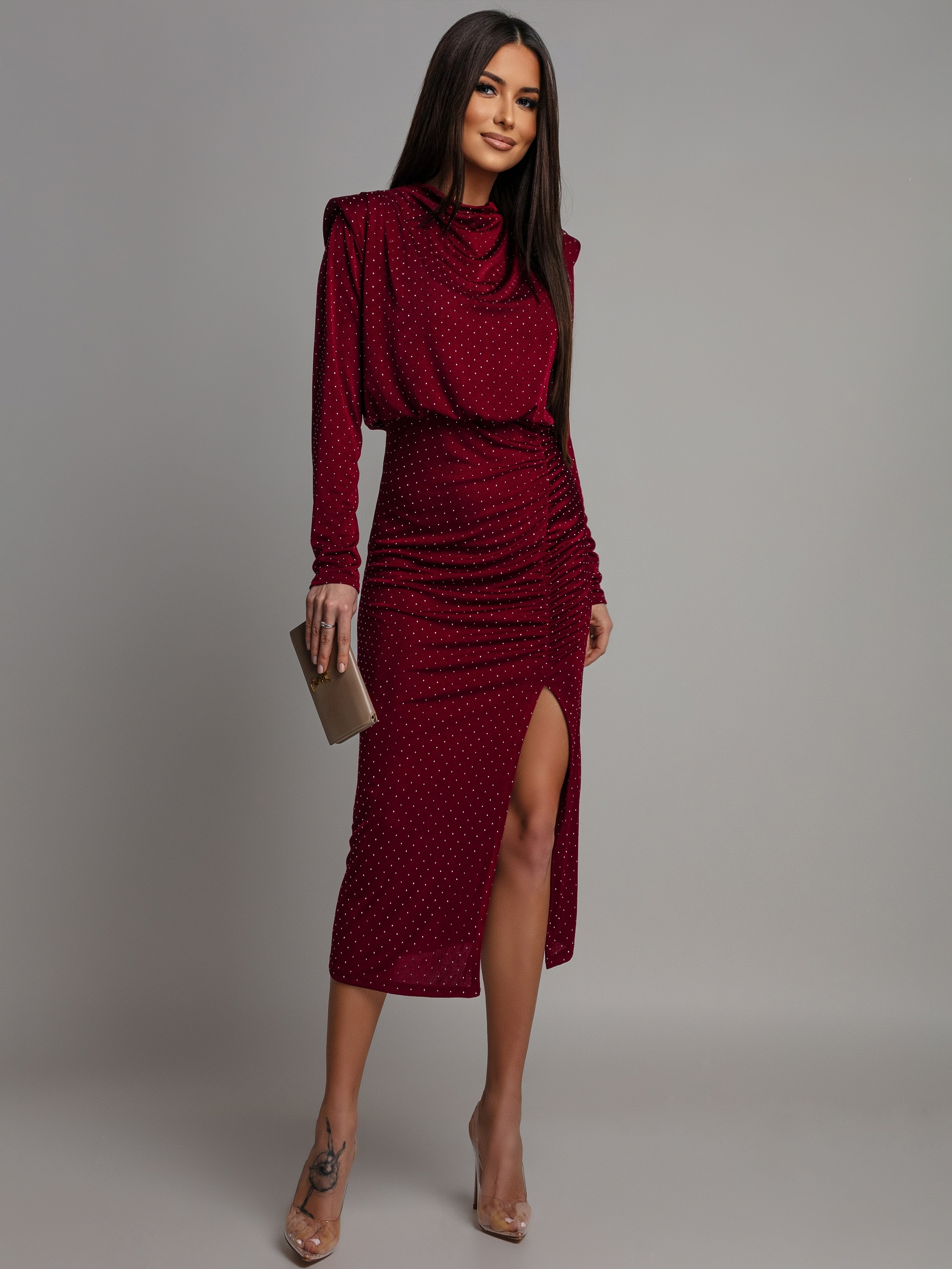 Sukienka midi z ozdobnymi cyrkoniami i marszczeniem na długi rękaw bordowa