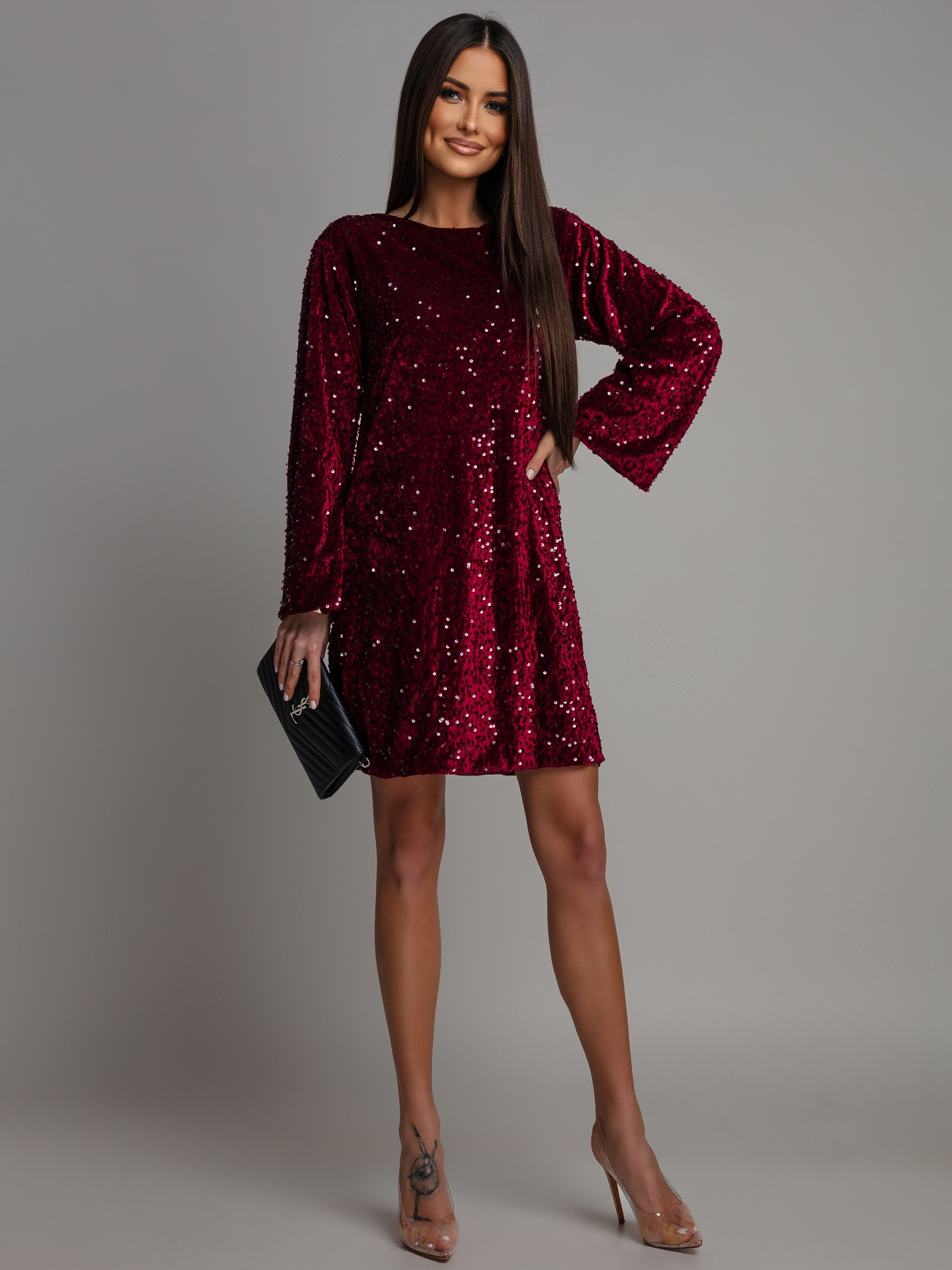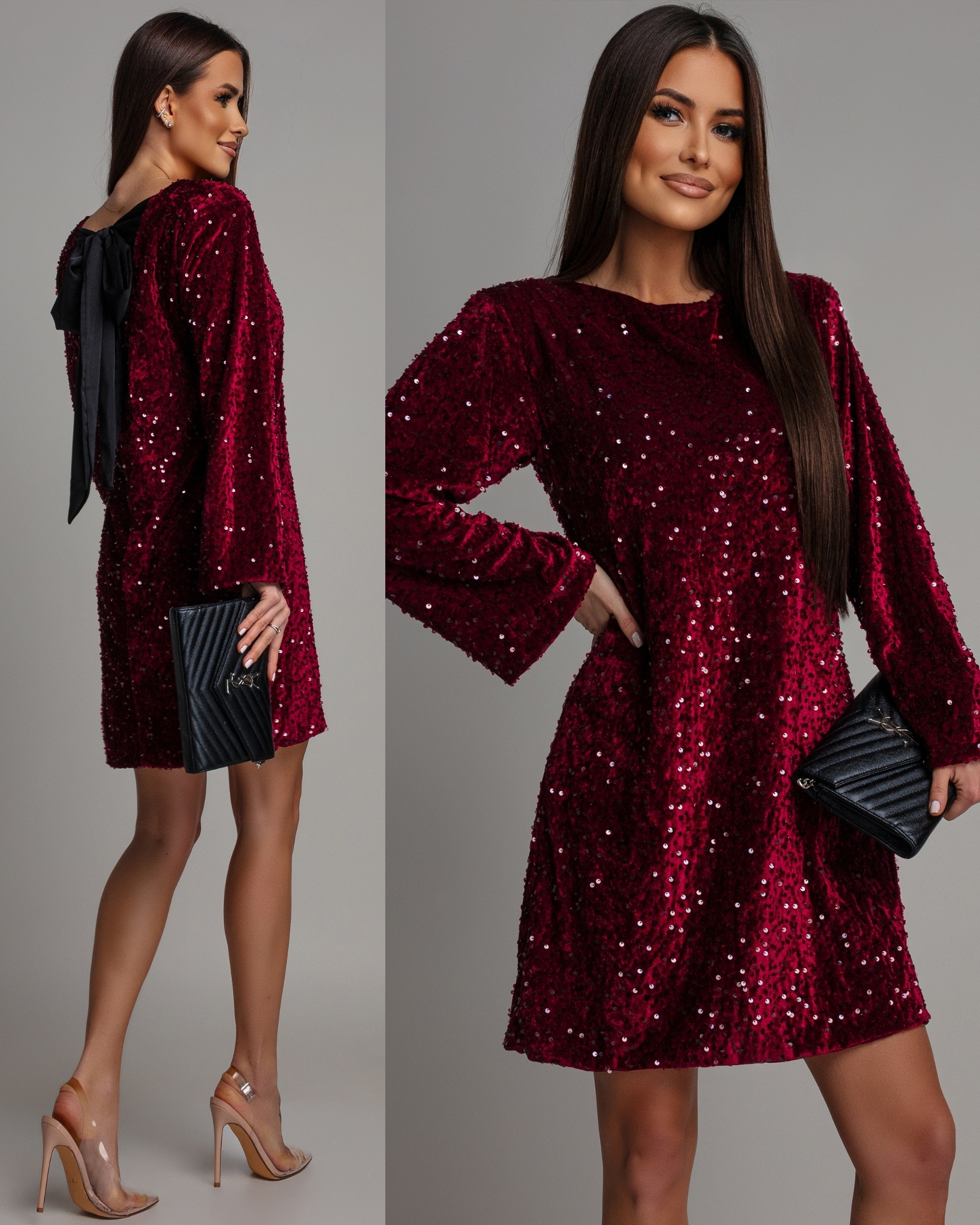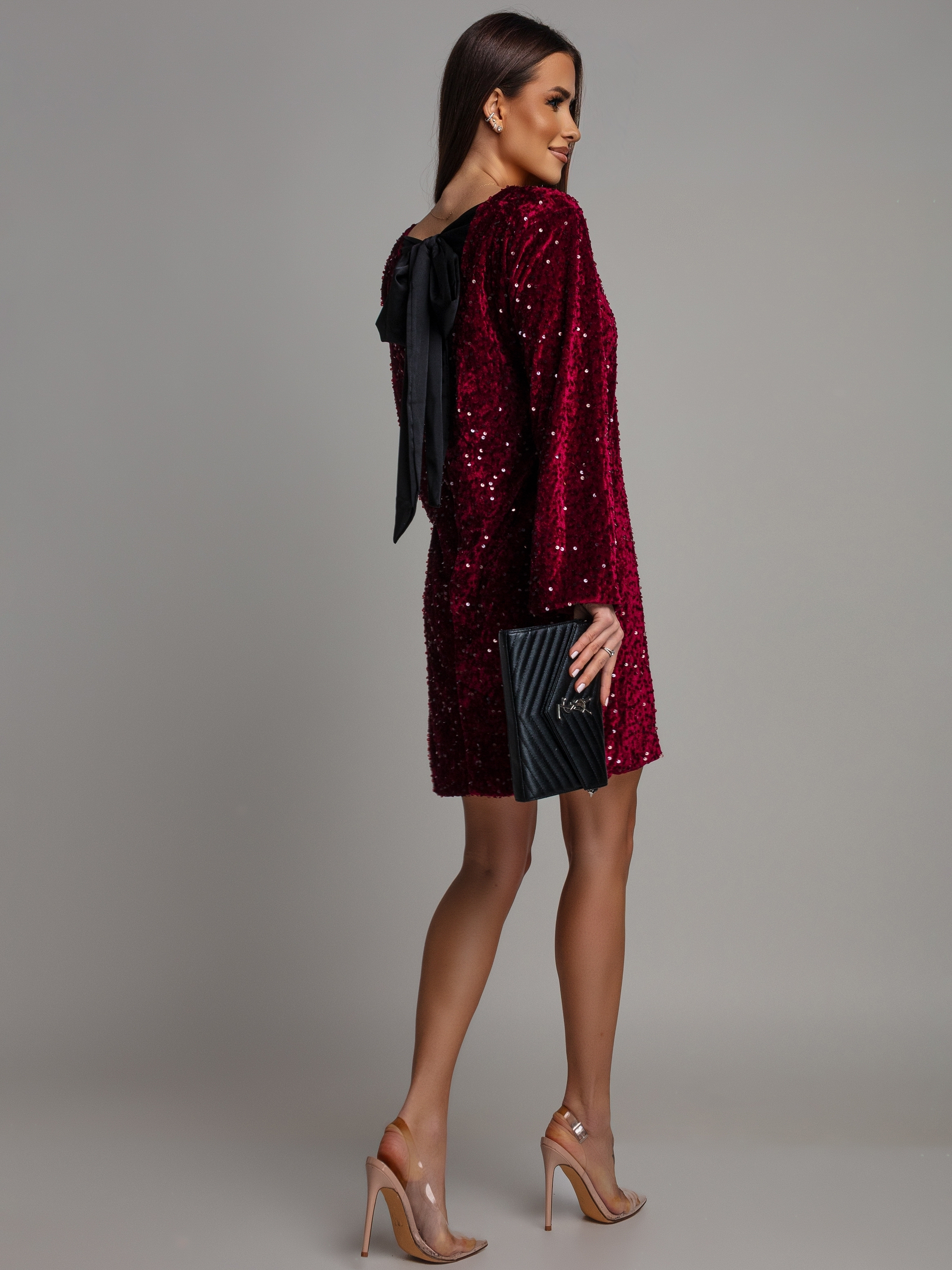 Sukienka mini cekinowa na długi rękaw z ozdobną kokardą bordowa