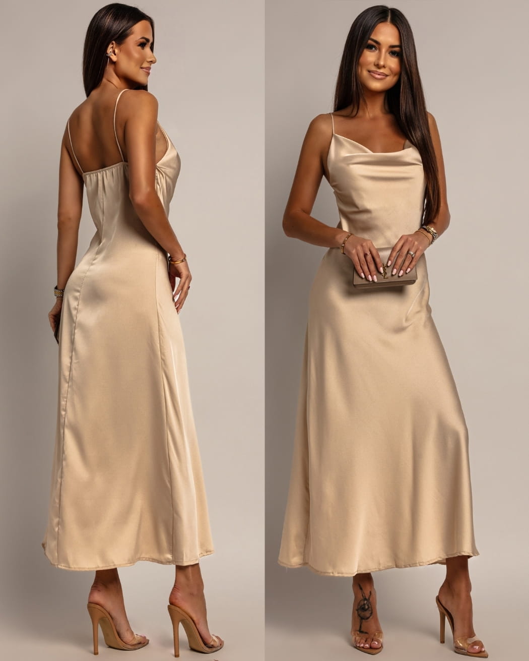 Sukienka satynowa midi klasyczna beżowa