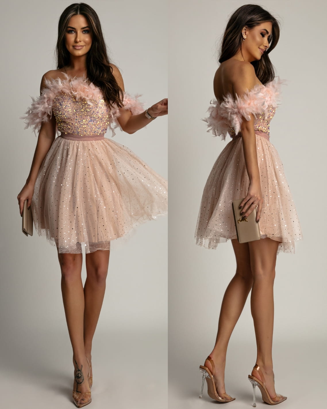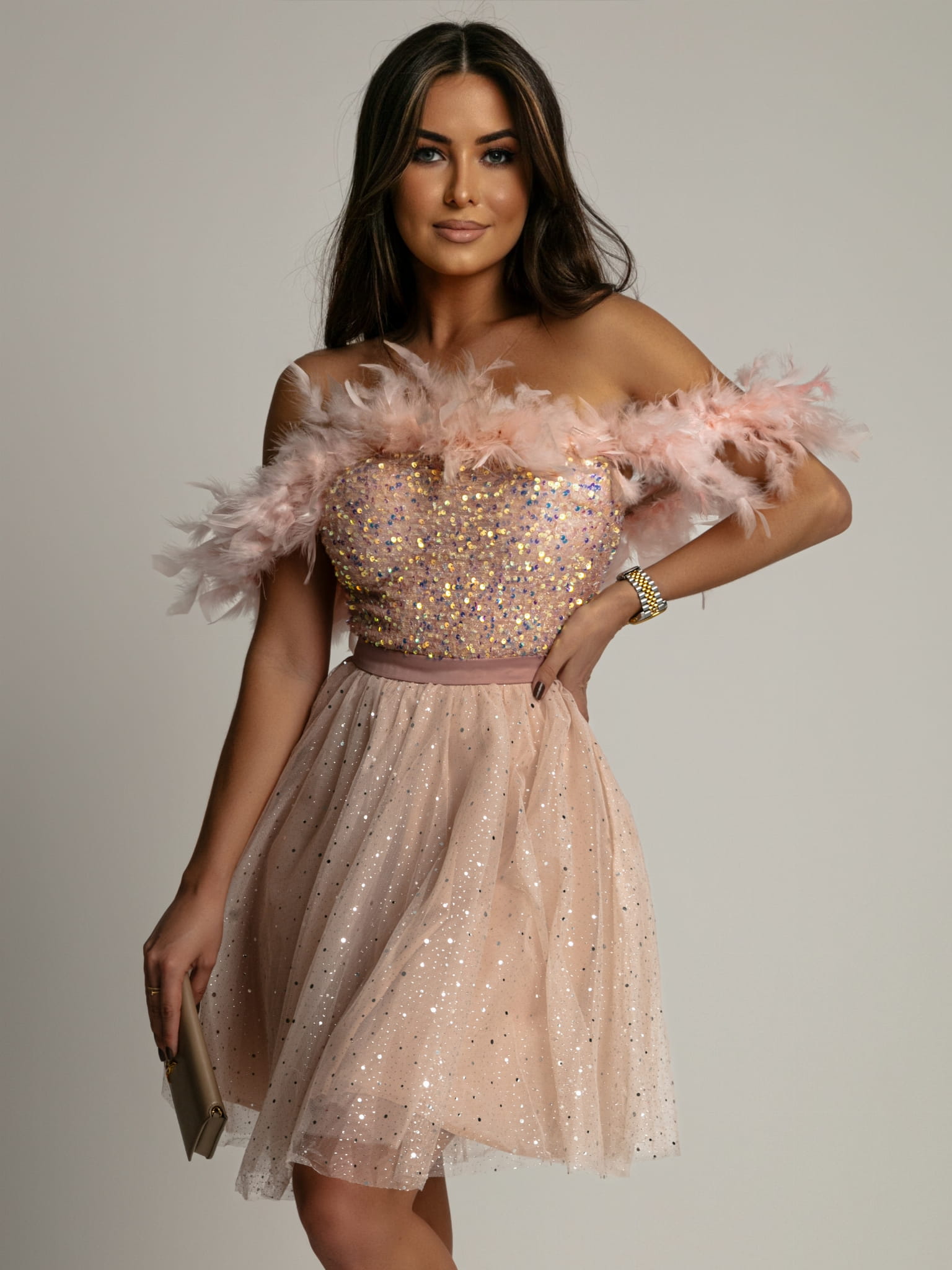 Sukienka tiulowa mini z cekinami i piórkami beżowa PREMIUM