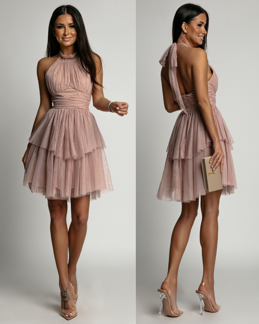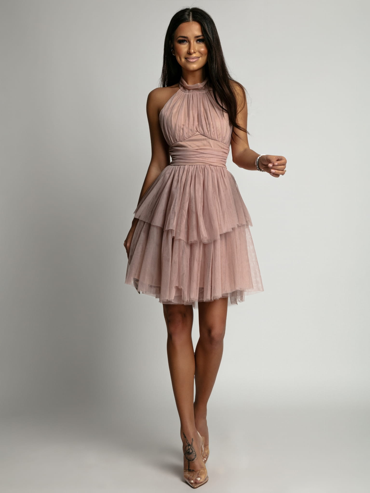 Sukienka tiulowa zakłądana na szyję krótka beżowa PREMIUM