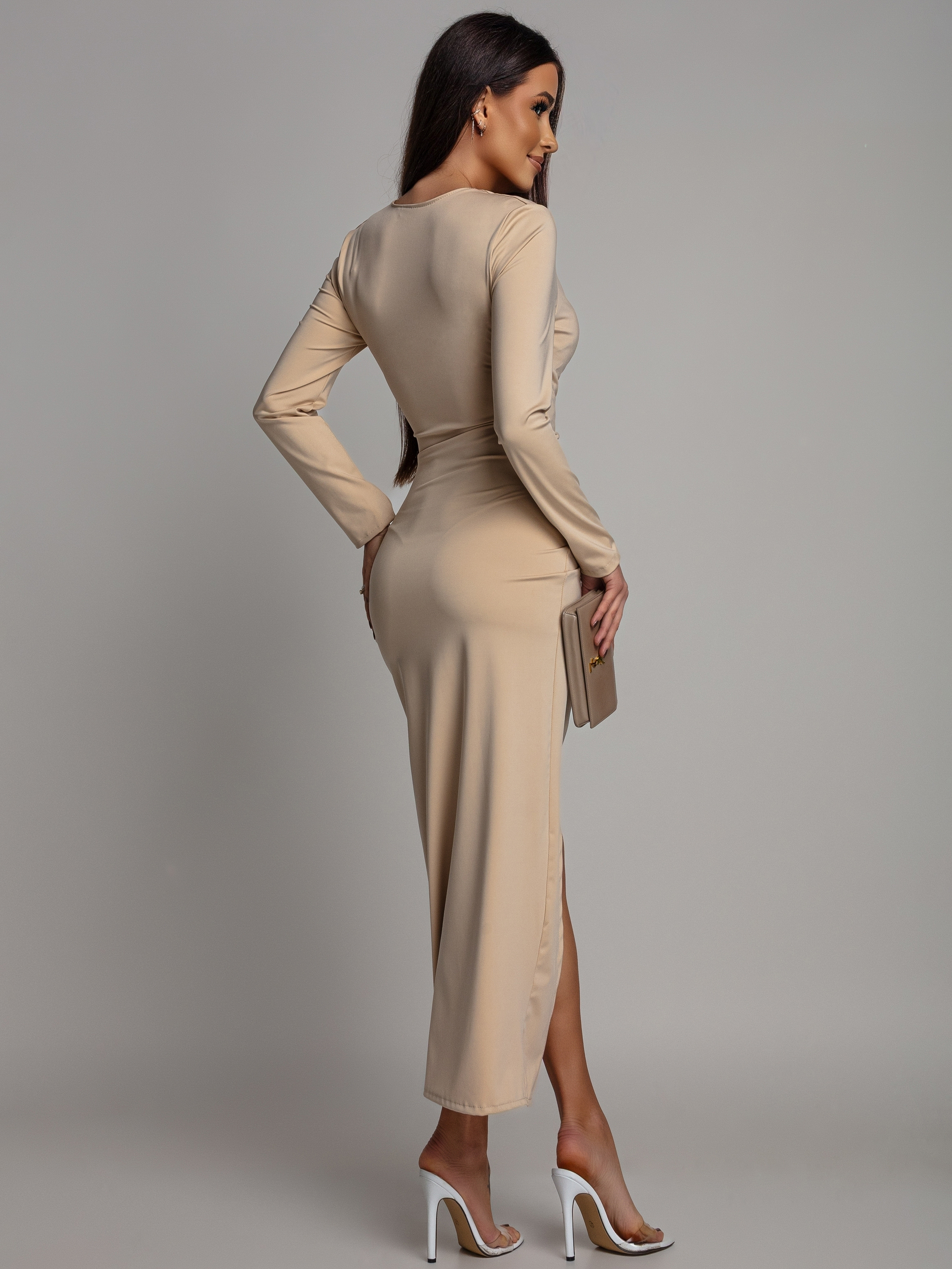 Sukienka z ozdobnym marszczeniem i rozcięciem na długi rękaw beżowa